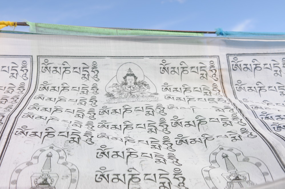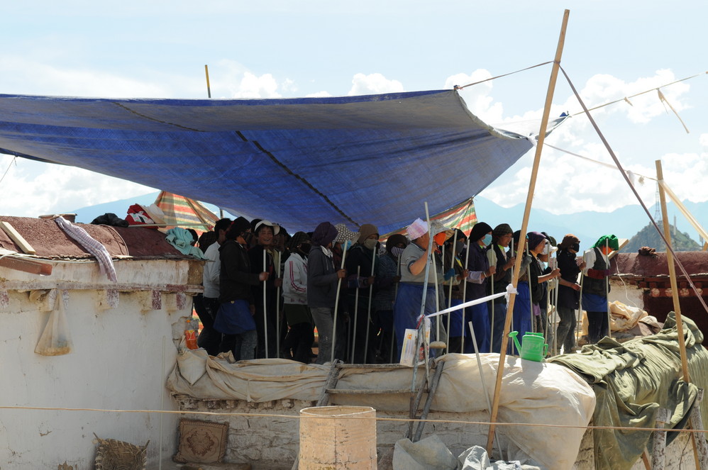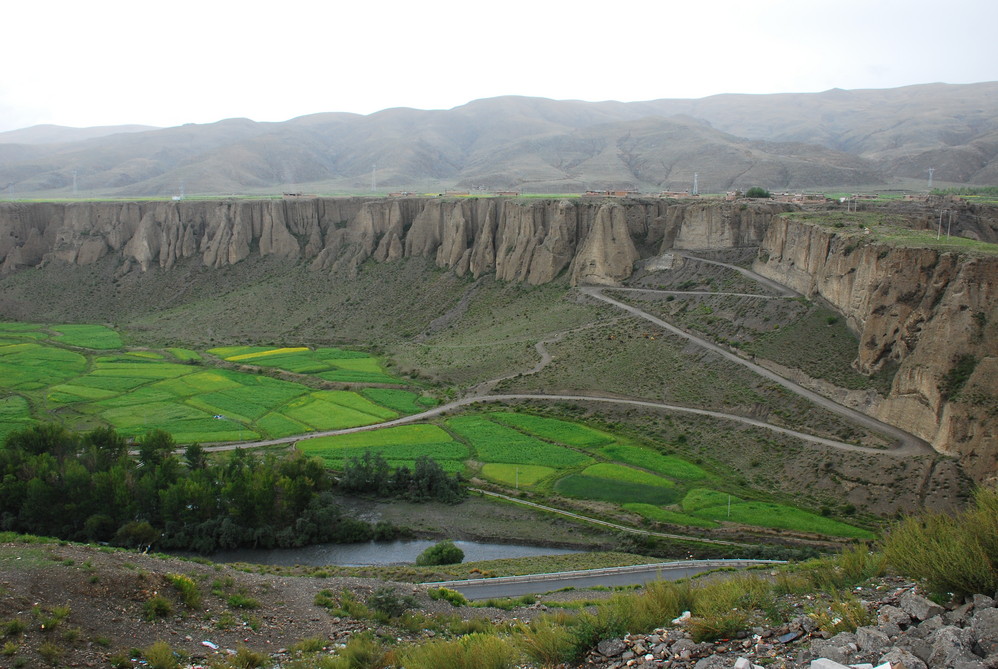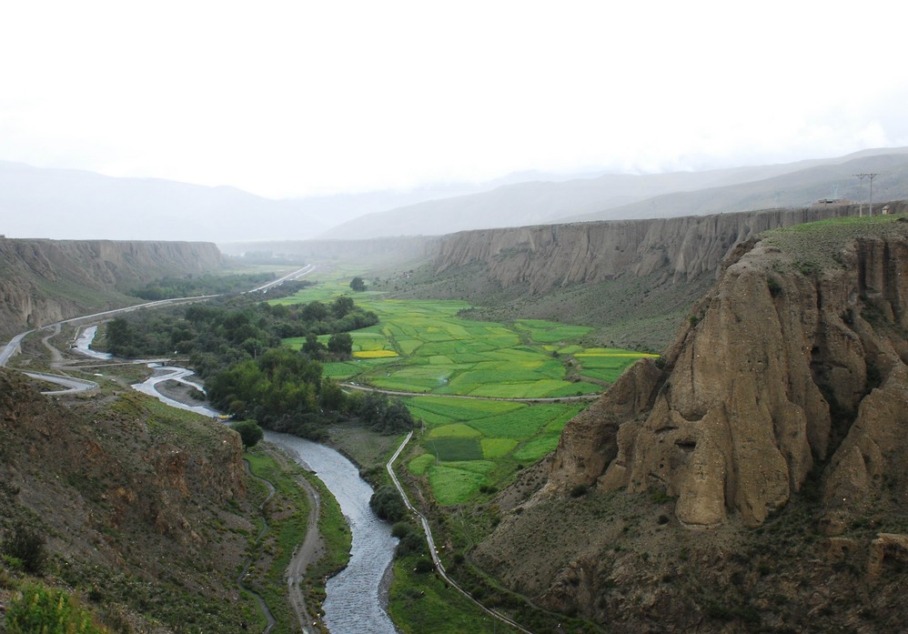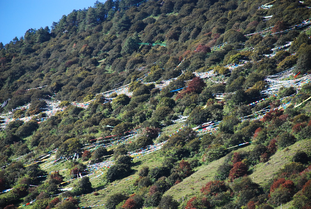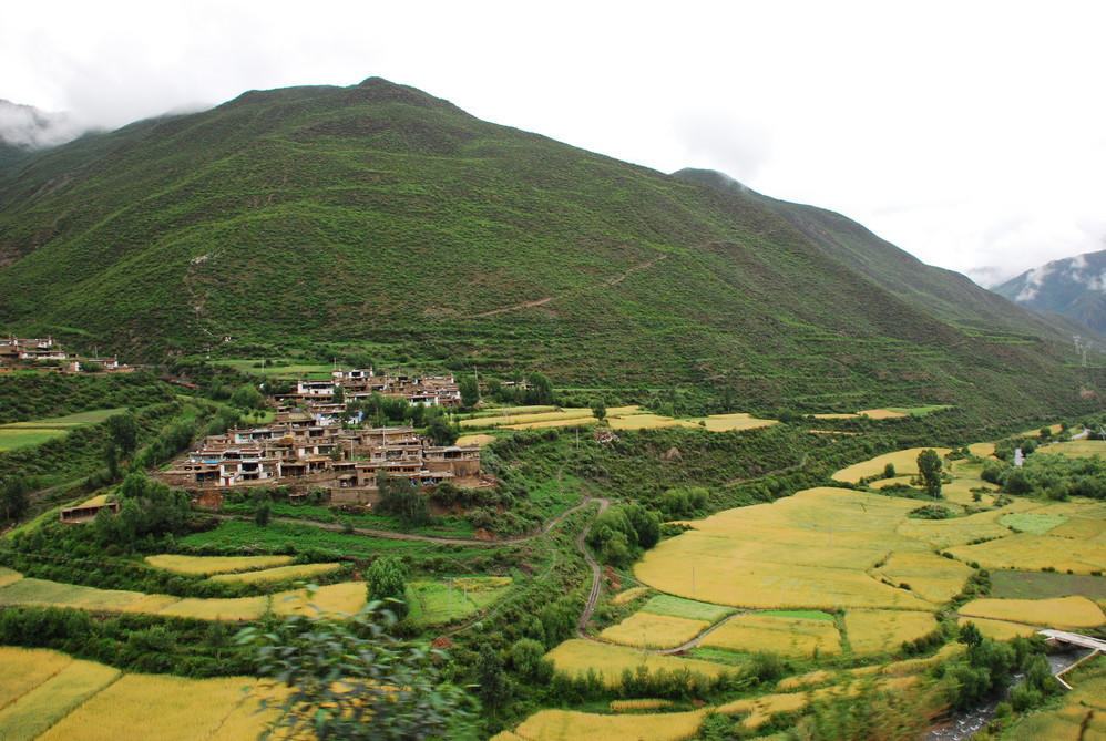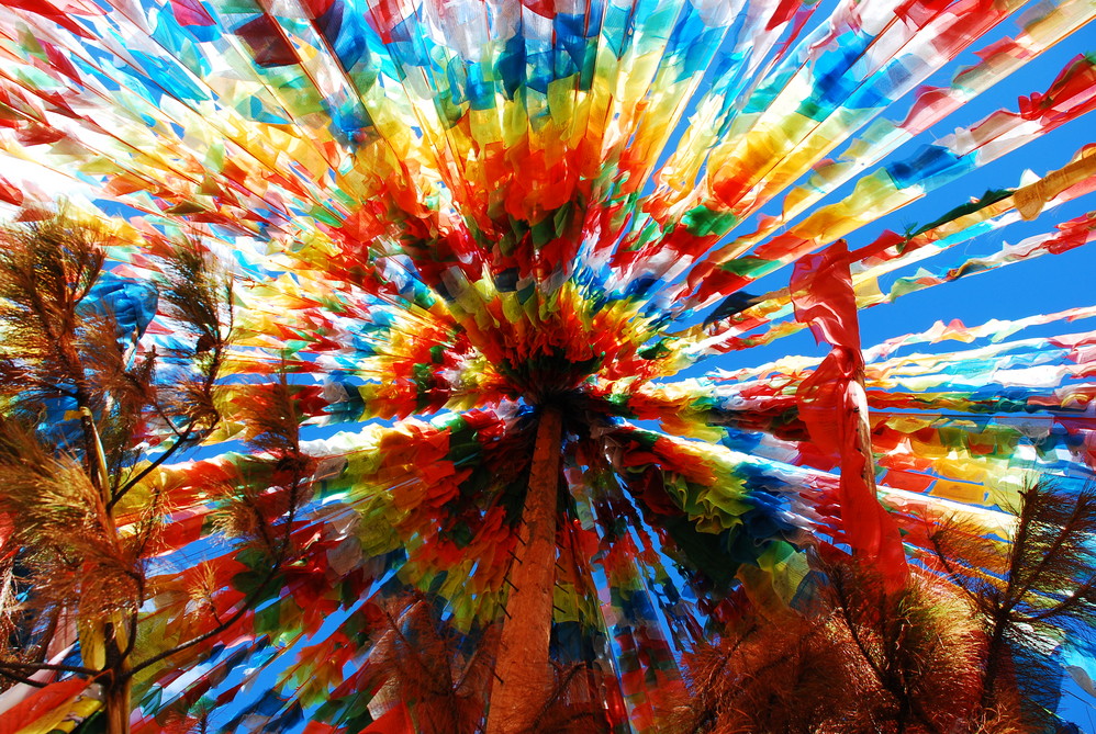 雍布拉康上的经幡,在经幡庇护下丰收的田地