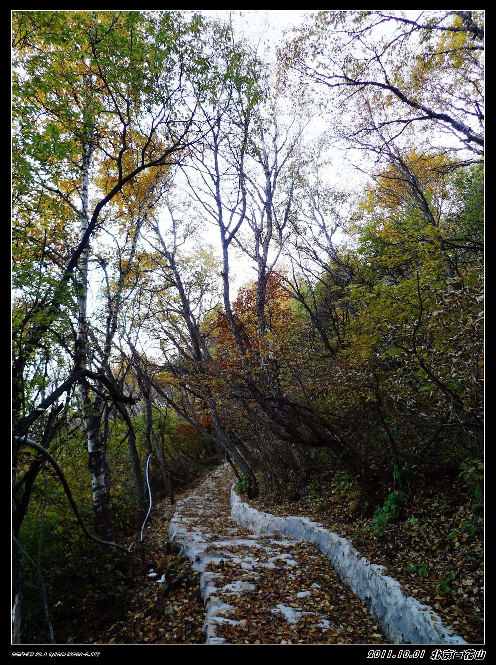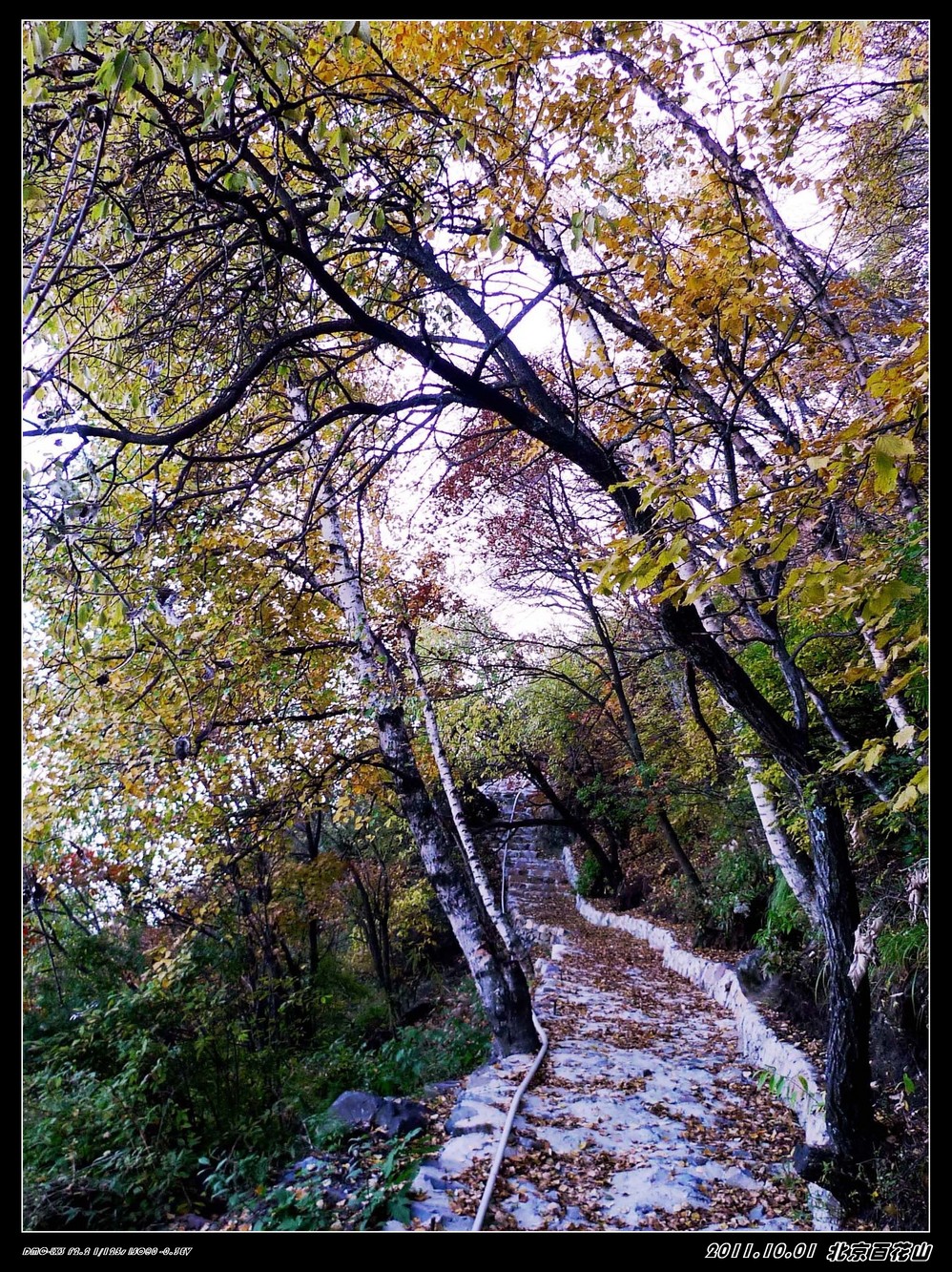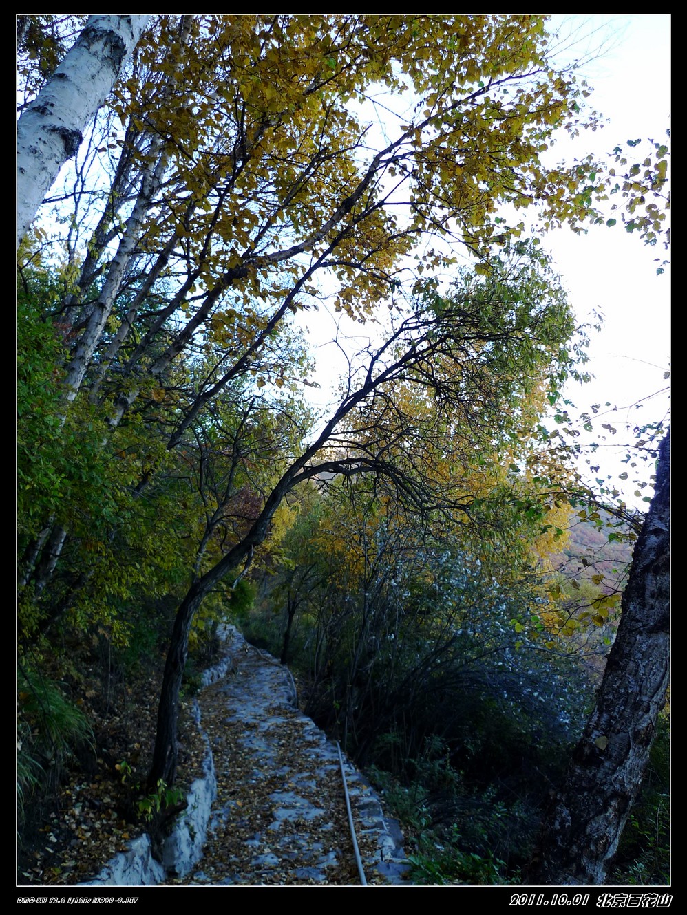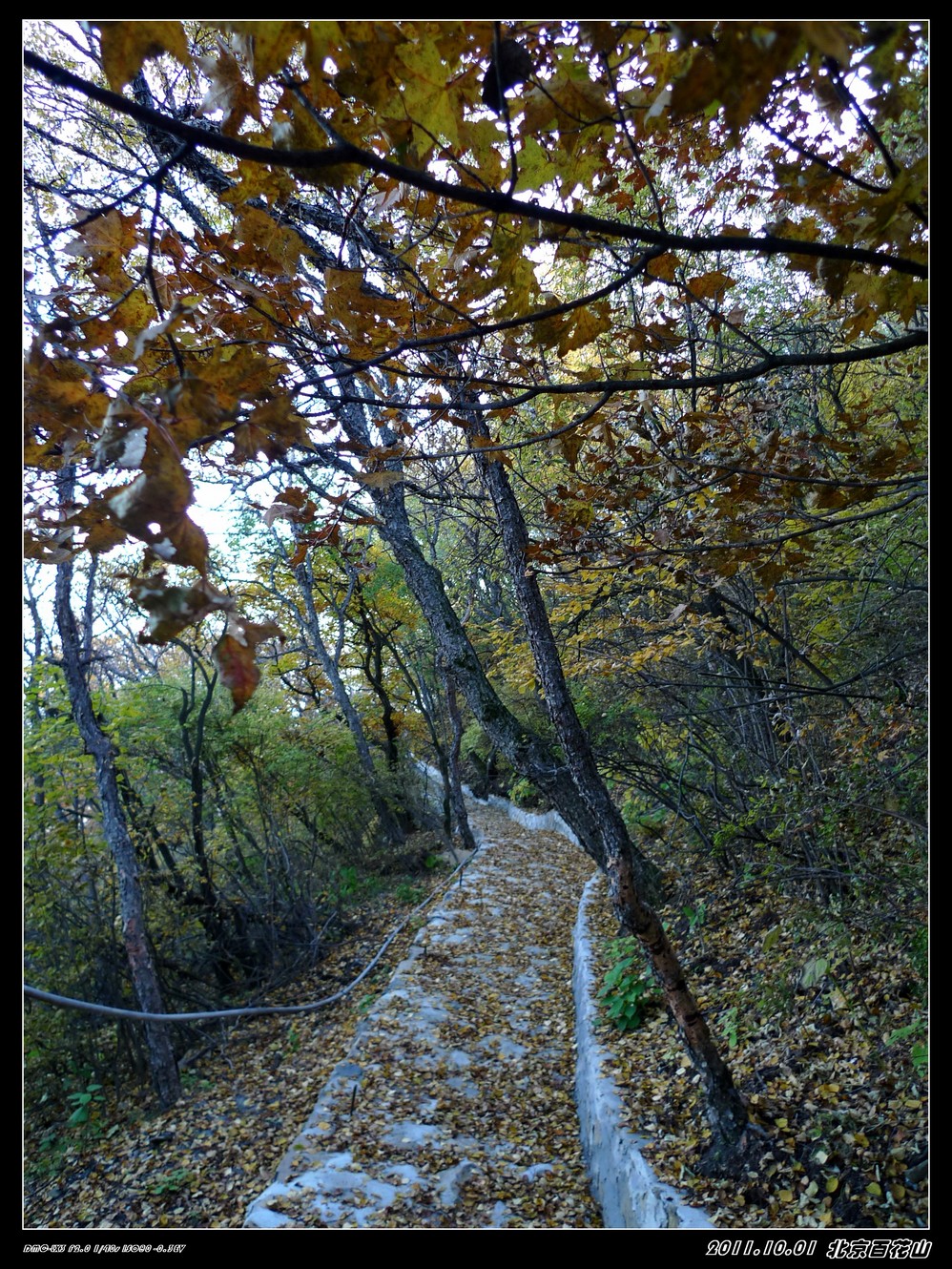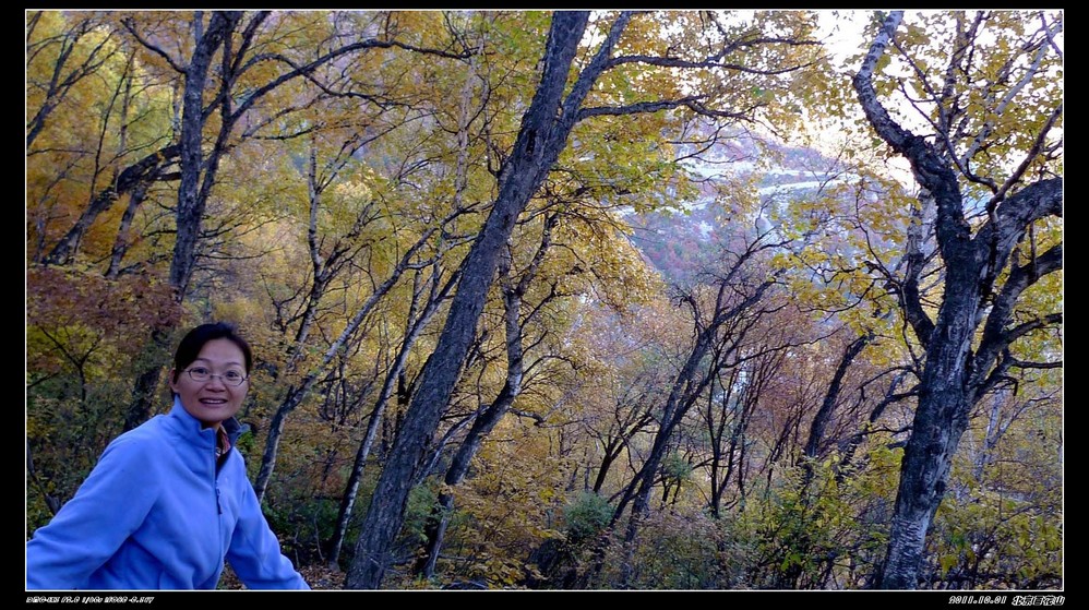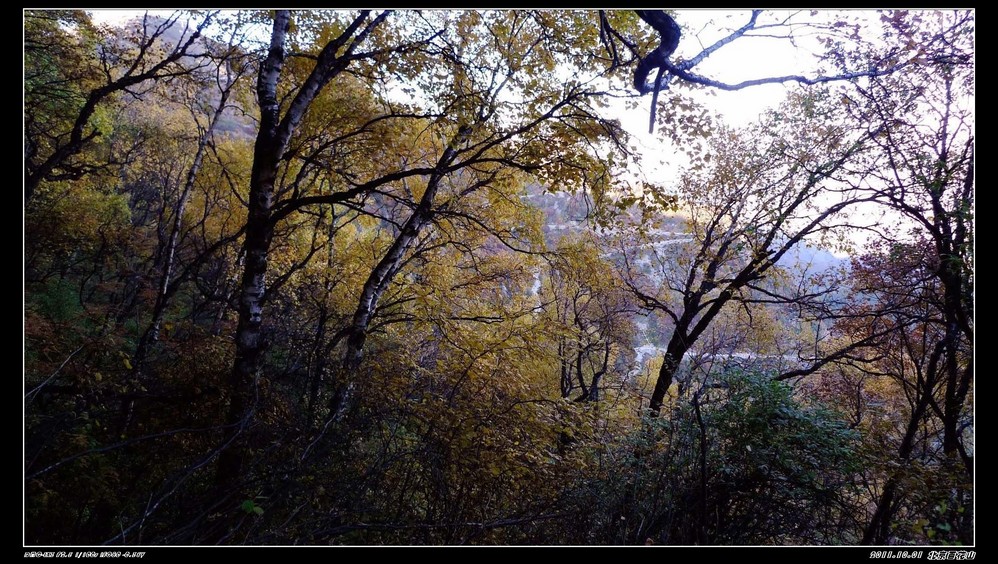 我们到了山顶玩了好一阵子,过了一个来小时他们才很辛苦的爬到山顶。我们在山顶上,就看不到什么红叶,还没有一路上的景色飘亮,我直后悔没有跟他们走山路上来,我就把车钥匙给了另一朋友,让他帮我开车下去,我和老大两人要走他们上来的山路,寺院门口集合。我和老大下山那段才拍到这么漂亮的黄叶,但山路是修好了,但很不平整,一路上才能体会到他们上山的艰辛,还好我们是下山,就容易多了。我们到了半山腰的寺庙集合时,才发现所有朋友也几乎同时都下来了。原来是他们到了山顶都走不动了,还好是我那辆车,他们来回两趟接送,才把他们送下来的。