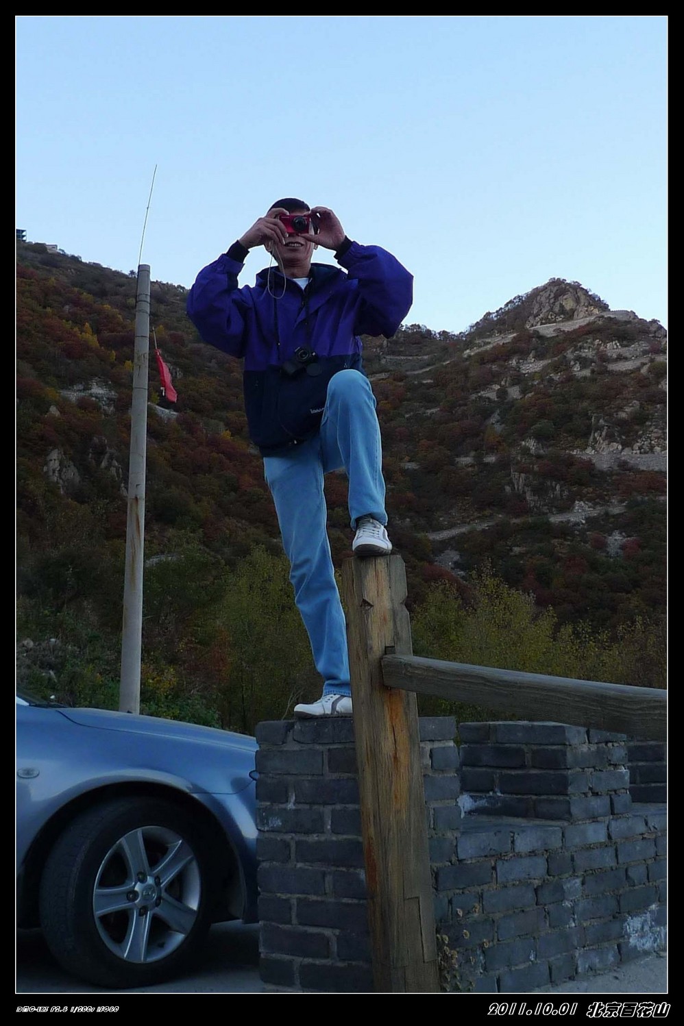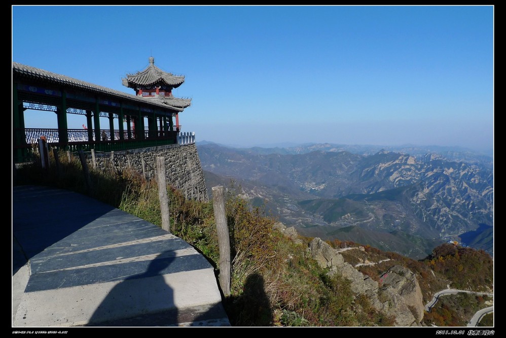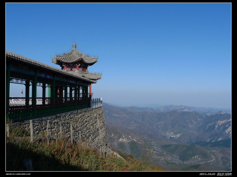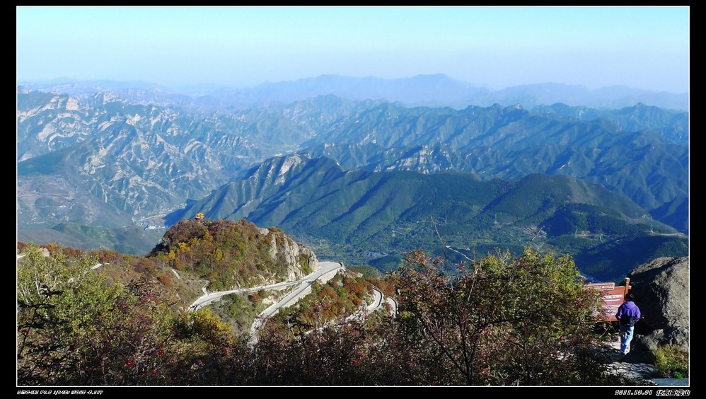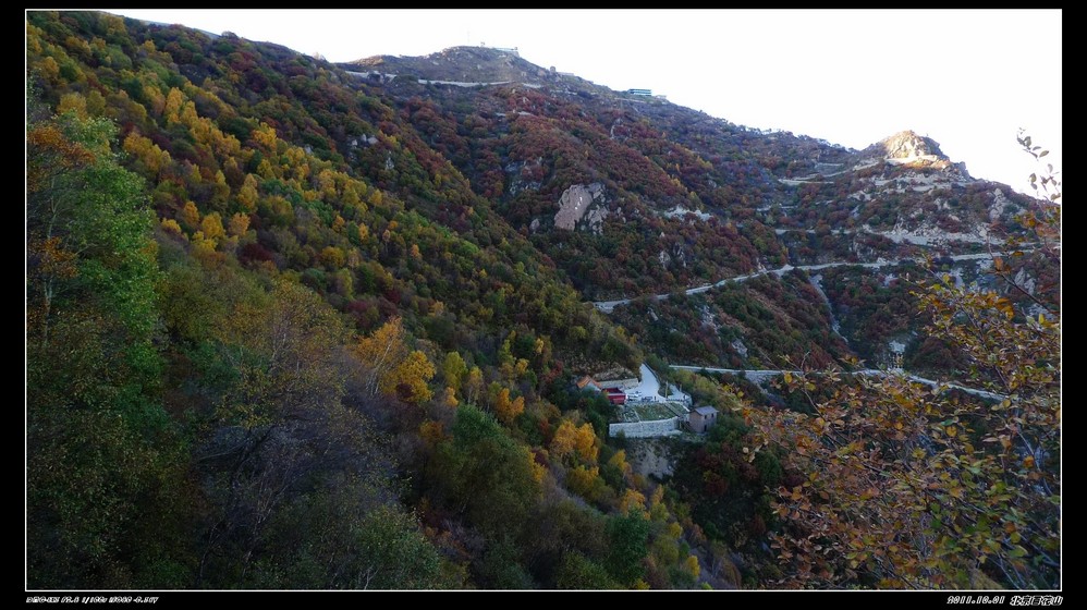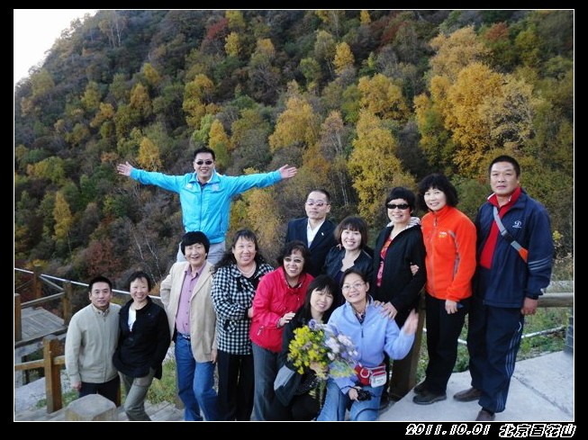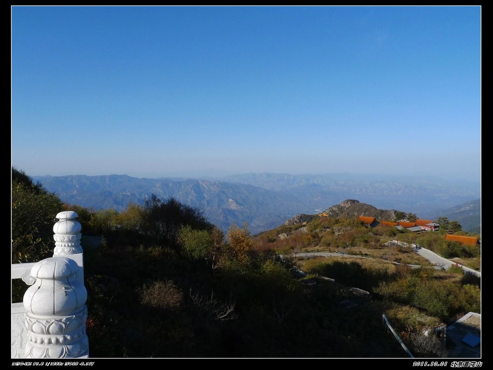 国庆节前就有打算一起出外走走,定去百花山也是前一天的下午才决定。时间匆忙,也没有好好做好功课,但网上查了下驴友们的功略,基本上去百花山最好的季节是在6-8月,到百花山是看漫山遍野的花海,但这个季节错过了。网上驴友们都介绍的是门头沟的百花山,但我们阴差阳错去了房山的百花山,房山这边是走的108国道,从南山上山,可以绕着山路一直开车上到山顶。 那天我们是走108国道从房山这边去百花山是可以一直把车开到山顶的,但那天我们一行14人,开了四辆车,一路开到半山腰,(是已经进入购票大门后的)。路经一个寺庙,我们把车停下休息观景,有部分朋友提出要爬上山顶,但也有朋友怕累不愿意爬山的。我只好开一辆车,一共五人是开车上山的,其他九位是在小寺庙左边小山道上山,其他那三辆车就放在小寺庙门口。