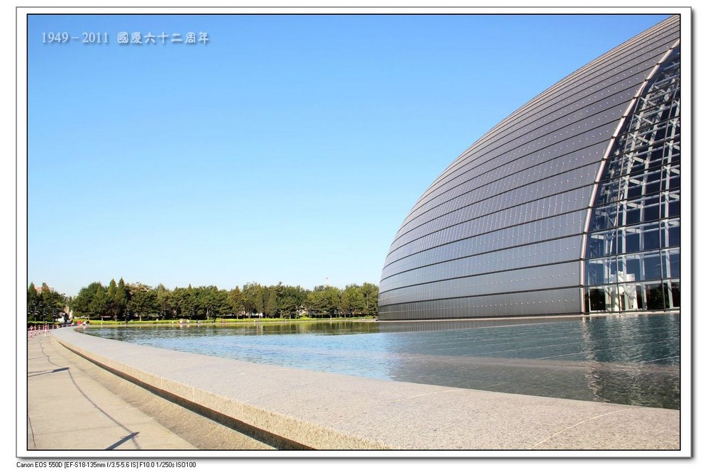 从人民大会堂南侧的小路走进去,就走到了国家大剧院。这里照相最美的不是正门,而是它的南边。