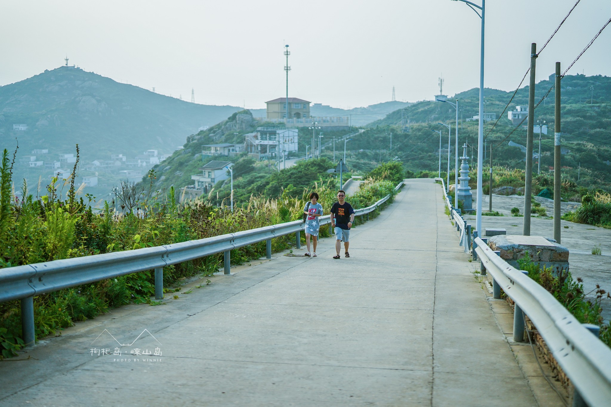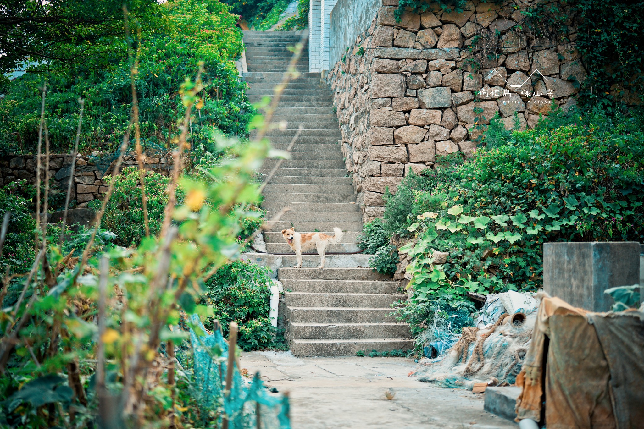 伴着咸湿的海风,沿着斜坡走,然后走到小屋,又顺着石梯向下,经过路旁弃船,穿过一条车道,远处对面一座嵊山岛。这些景色尽收眼底,又勾起我们回归自然的无限遐思。