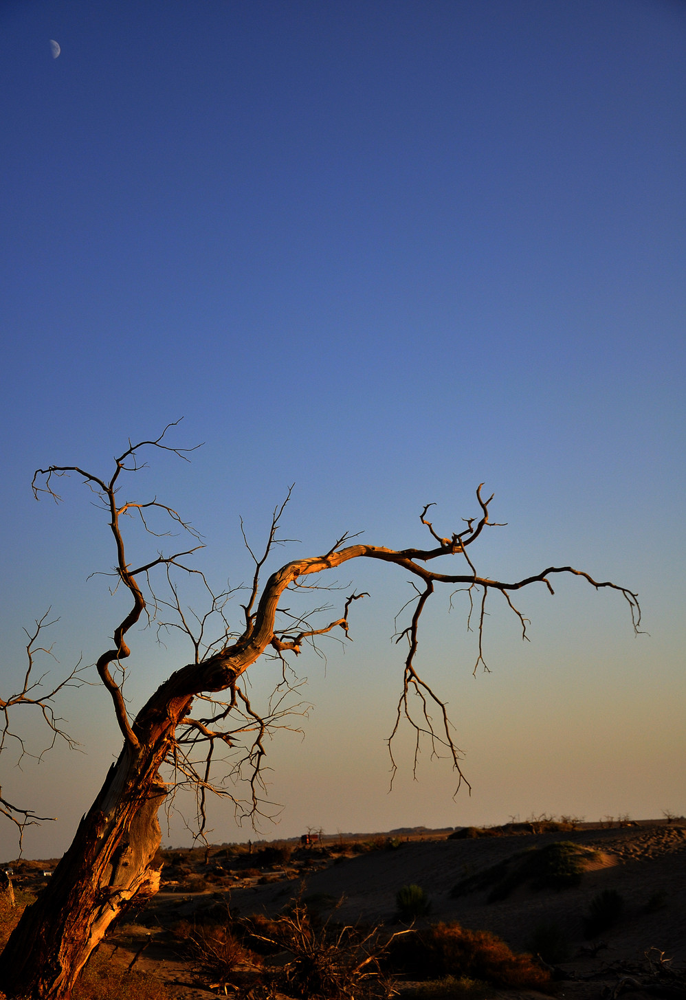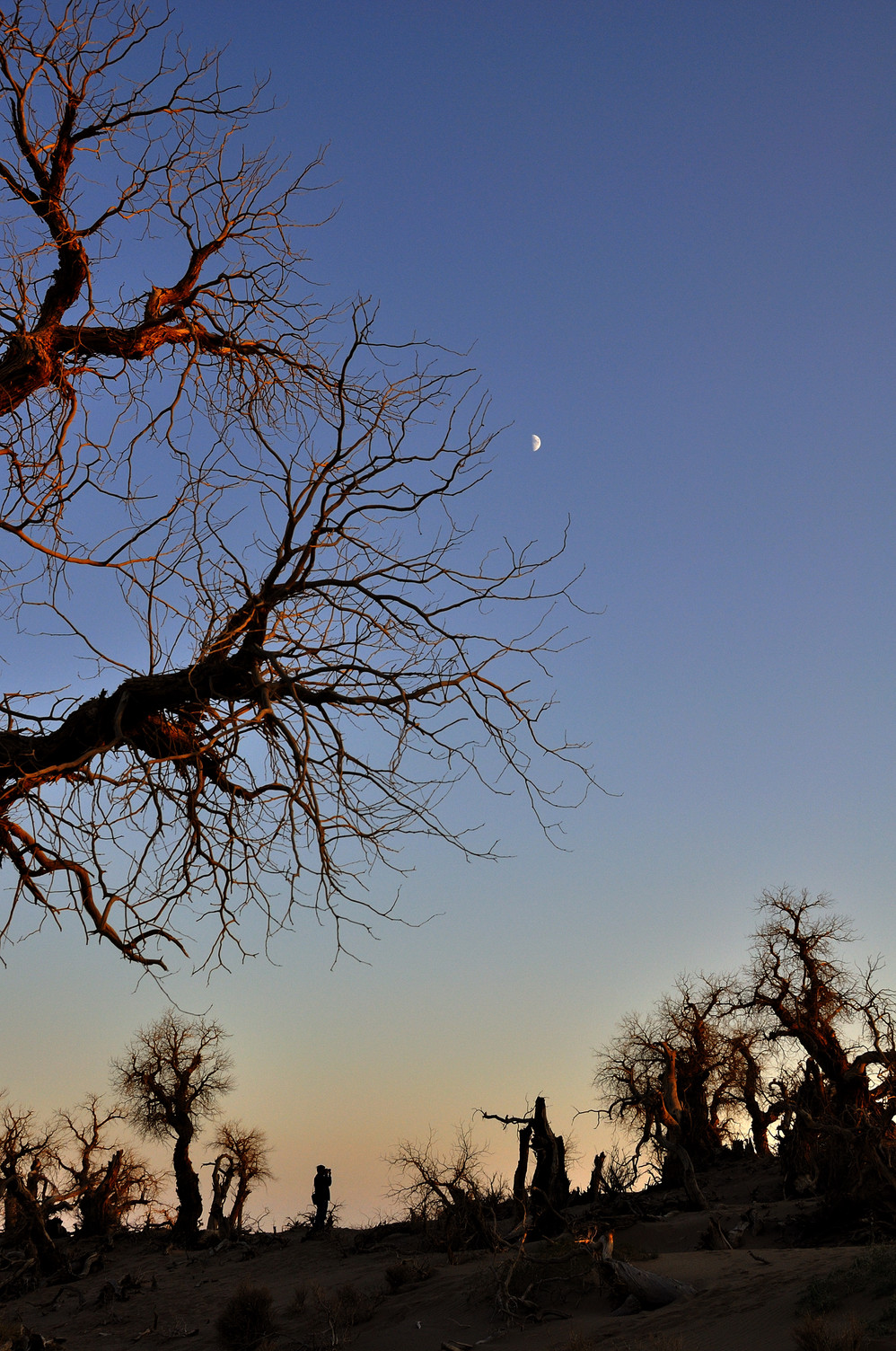 6、枯树林:从达镇去酒泉 的路上,在有黑城路标的路口不要左转,再向前直行几十米,右手边有枯树林的指示牌。门票30(人多砍价能到20),里面有和怪树林一样的风景,活着和死去的胡杨,关键是人少得多,可以慢慢去拍。另外,一直往里走,可以爬上一片沙山,对面全是沙漠戈壁,可以拍日落。