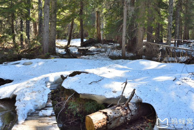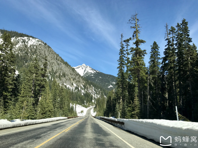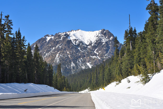 北喀斯喀特景观公路(North Cascades Scenic Highway)是20号公路最美丽的一段,冬季因大雪封山而关闭,五月中旬才开放。沿途的山壁上不时有瀑布倾泻,随着海拔上升,道路两旁渐渐出现积雪并越来越多。冰川覆盖的雪山雄伟壮丽,山口和徒步道仍有大量积雪,刀片比人还高的扫雪车挖出来的雪墙无比震撼!
