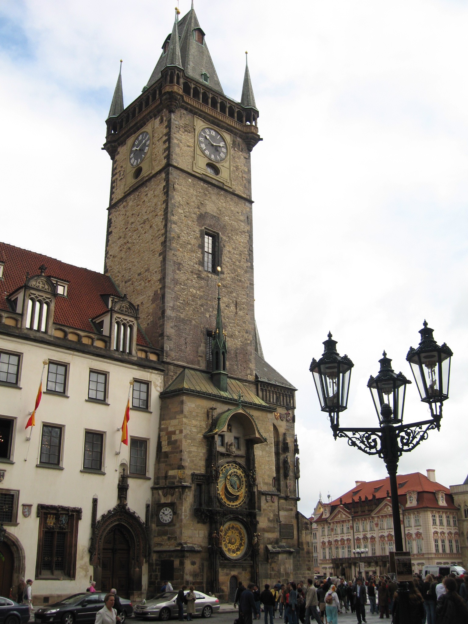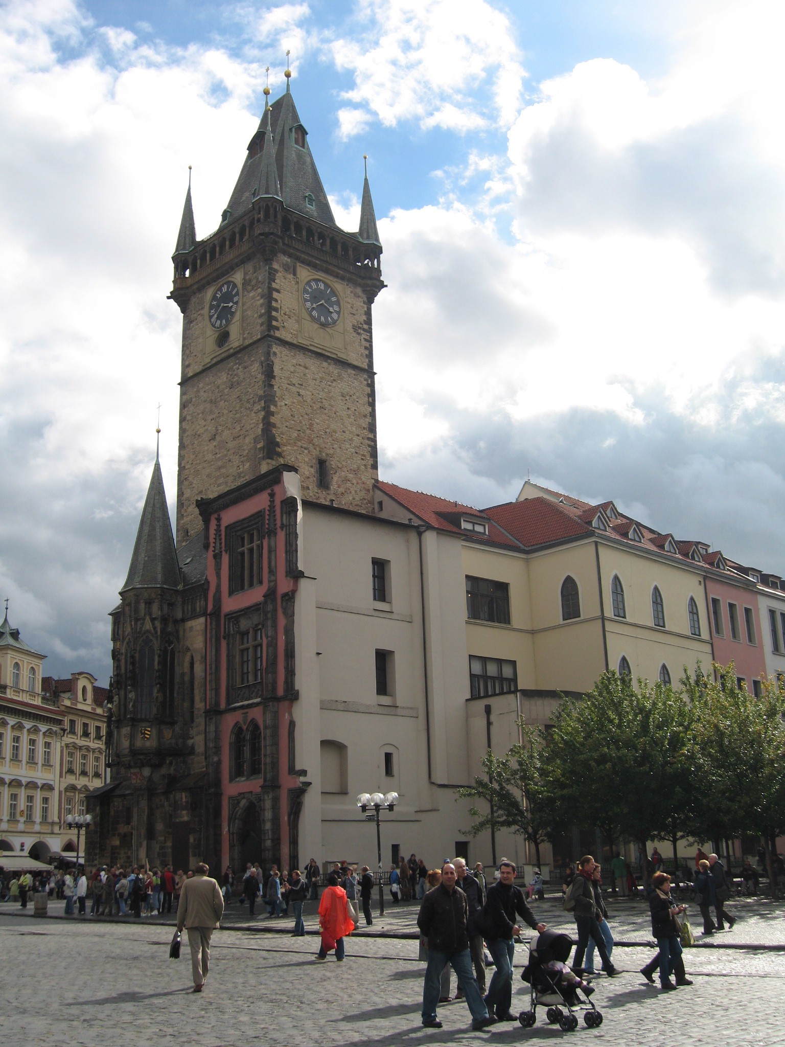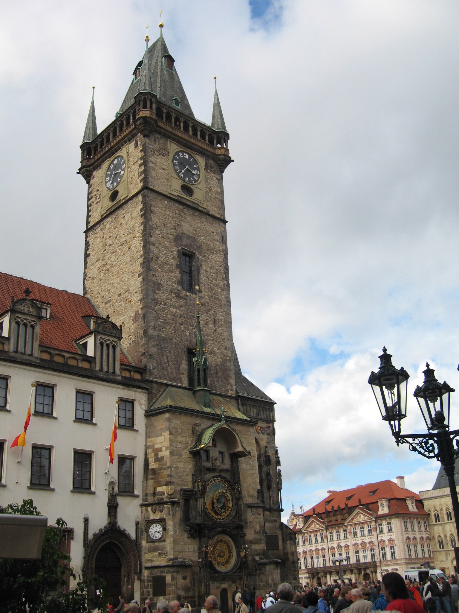 老市政厅在布拉格老城广场的北面,建于1338年,钟塔高70米,天文钟在其外墙上。二战期间被毁,战后重建的。钟塔可以坐电梯上去,在顶上俯瞰整个城区。