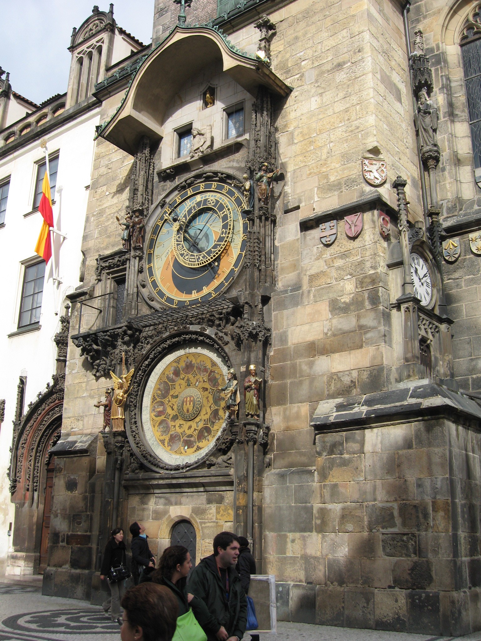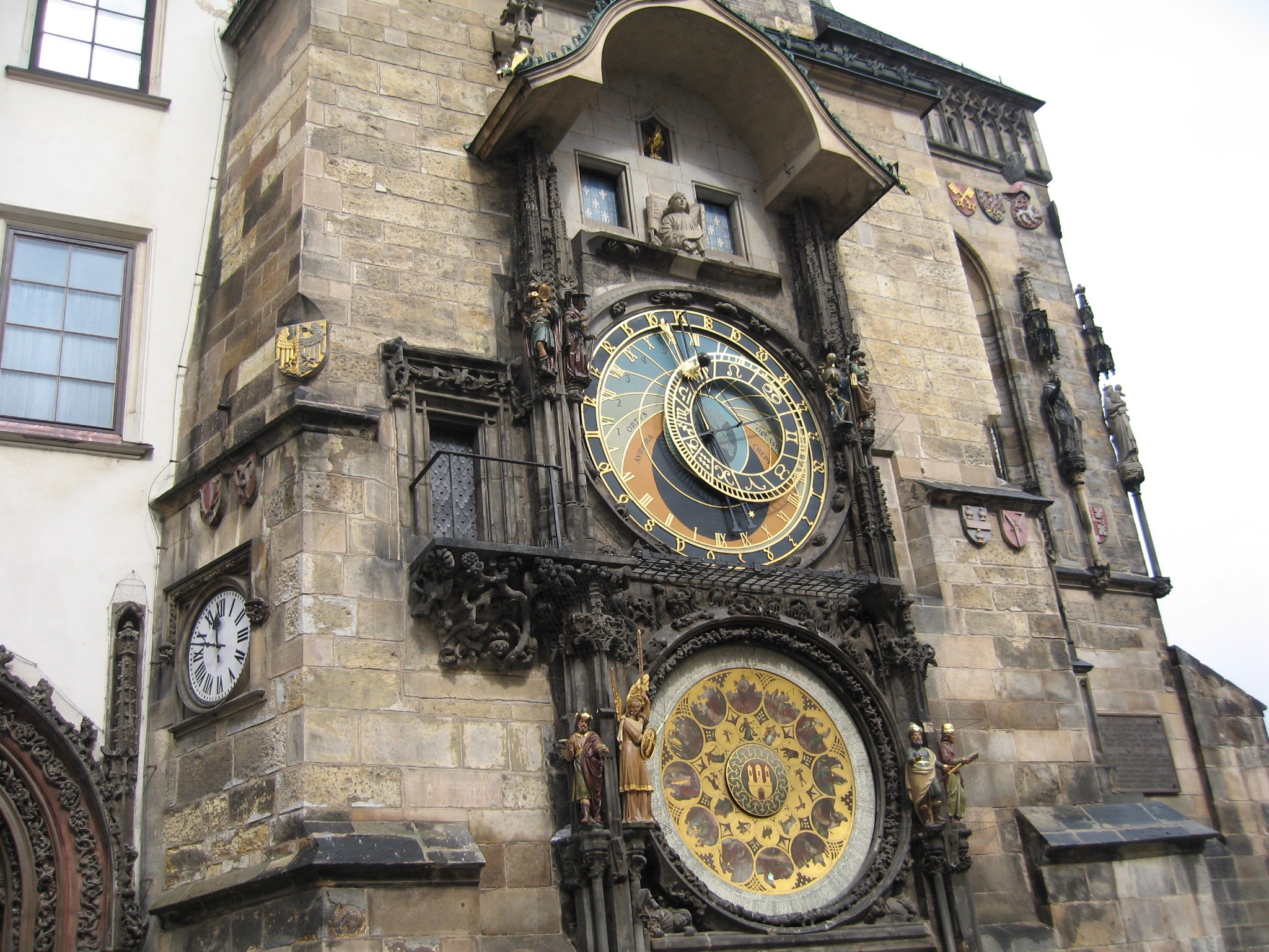 天文钟(自鸣钟)在布拉格老城广场的老市政厅外墙上,建于16世纪,由圣徒雕像、钟盘和年历三部分组成,每到整点报时。传说,为了防止世间再有这样精美的大钟,把修钟大师的眼睛弄瞎了。