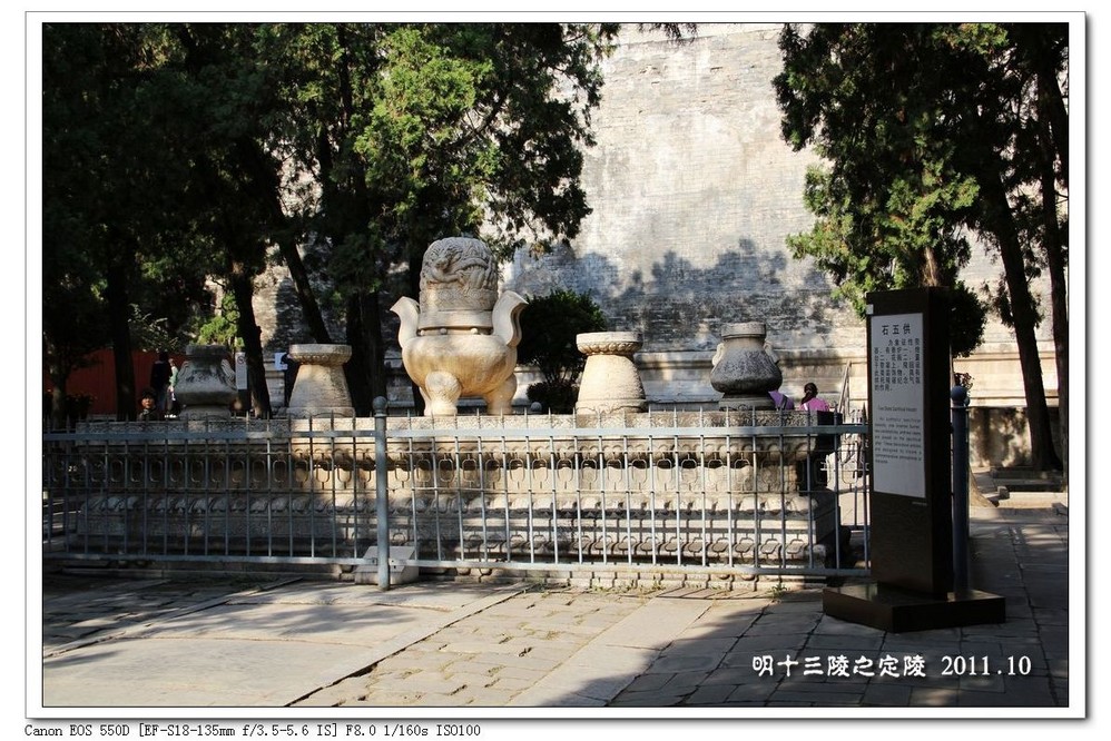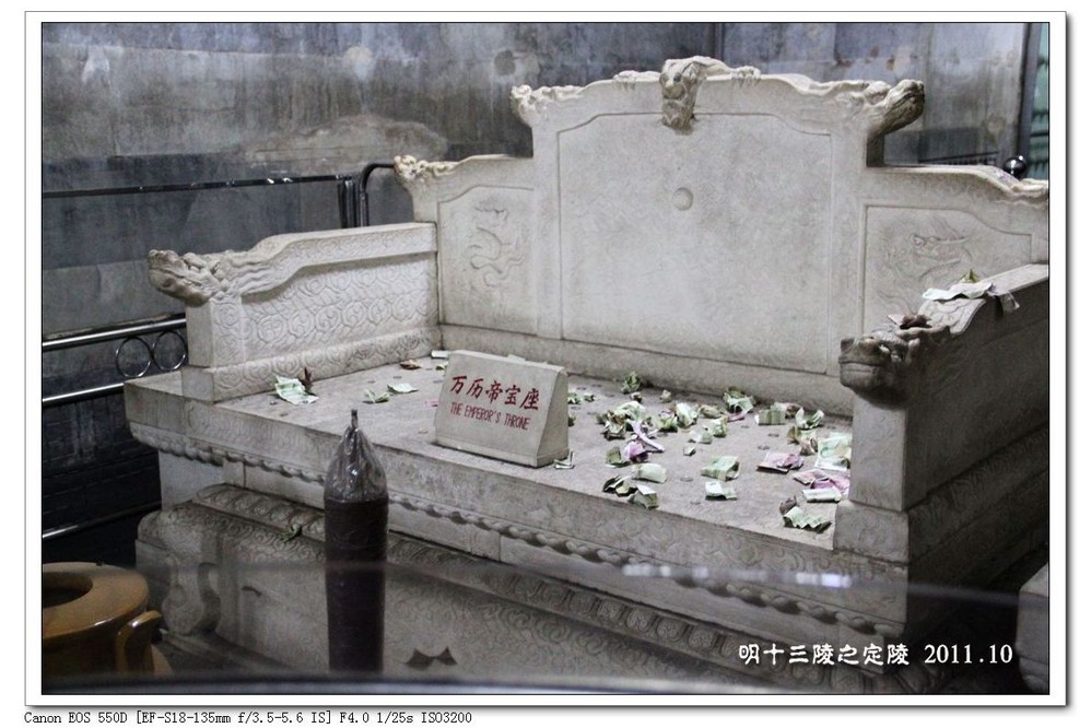 定陵 是明代第十三帝神宗显皇帝朱翊钧 (年号万历 )的陵墓。这里还葬有他的两个皇后。建于1584~1590年(万历十二年至万历十八年)。主要建筑有祾恩门、祾恩殿、宝城 、明楼 和地下宫殿等。定陵早在万历帝生前就开始营建,万历十二年(公元1584年)开工,历时6年方完成,耗银八百万两。陵墓建成时皇帝只有28岁,直到1620年才正式启用,该陵墓整整闲置达30年之久。定陵成为十三陵中最大的三座陵园之一。它的地面建筑共占18万平方米,前有宽阔院落三进,后有高大宝城一座。陵正门前方是三卒汉白玉 石桥。过了桥是高大的碑亭。亭周围有祠祭署 、宰牲亭、定陵监等建筑物300多间。再往后就是陵园最外面的围墙-外罗城(围墙外的围墙)。新中国 成立后,为进行历史科学 研究,试掘了定陵。墓中有各种珍贵物品三千余件。不过说现在都转移到博物馆里去了,在这里什么也没看到,就像一座空城。