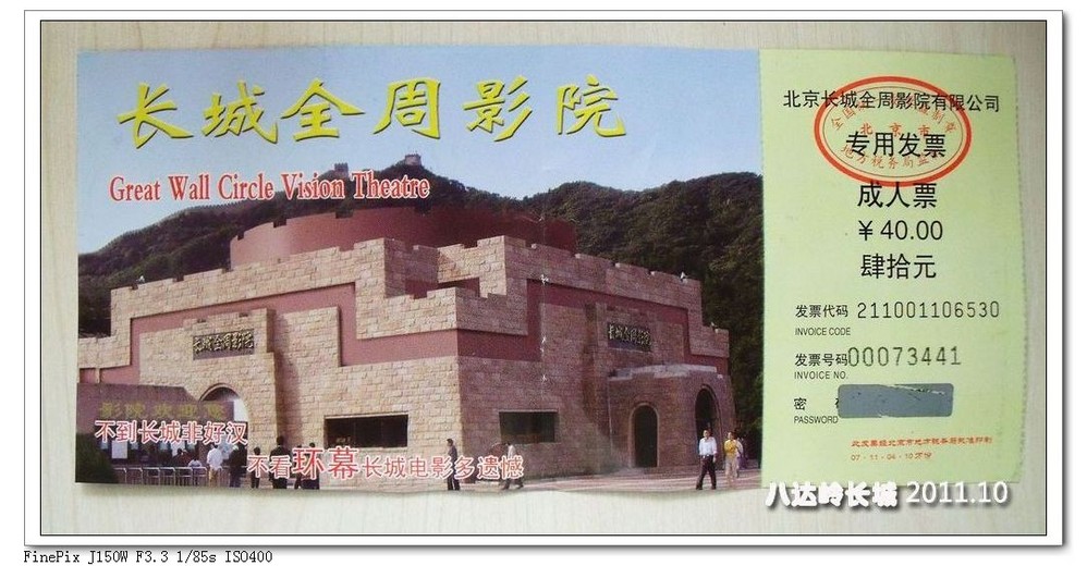 快到八达岭的时候,导游又隐晦的提出自费项目了,先问有没有要做缆车的,结果没有一个人要坐。她又说“因为咱们不坐缆车了,那就去看个电影吧”,说是360度的全周屏幕,看长城的介绍的,外面买票40元一张,跟团是25元一张。我还真实诚,下了车就跟着她去掏钱看了,后来我爸说有人没去看的。不过也好,了解下长城的历史,再去爬长城,更有意义。本来是想录下来的,可惜我相机的存储卡提前没处理好,里面存着别的内容,录了一半就空间不够用了,郁闷!