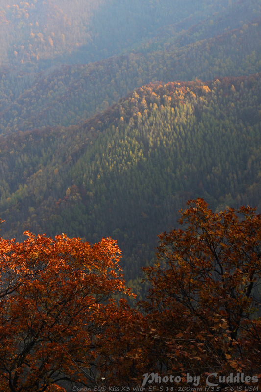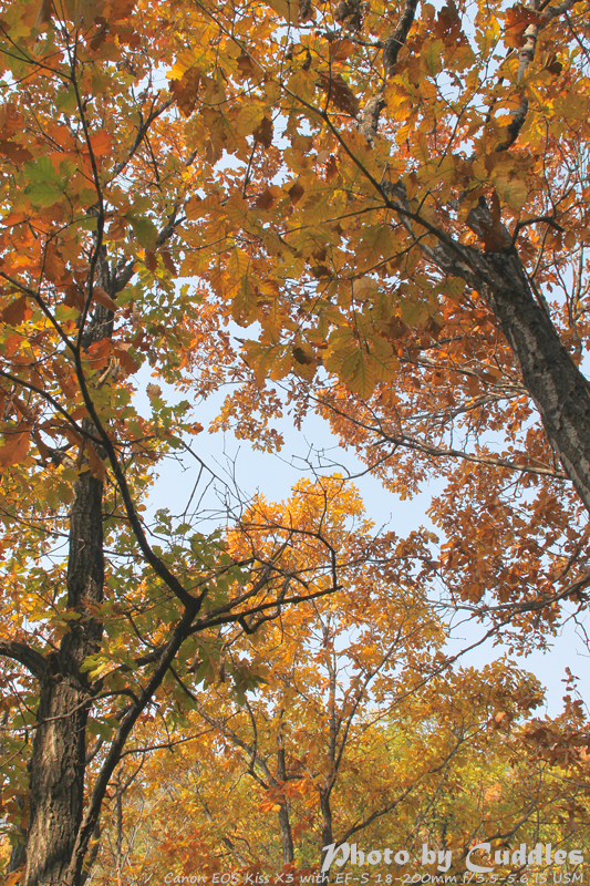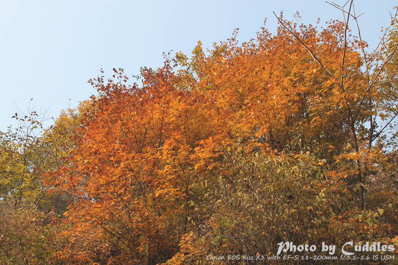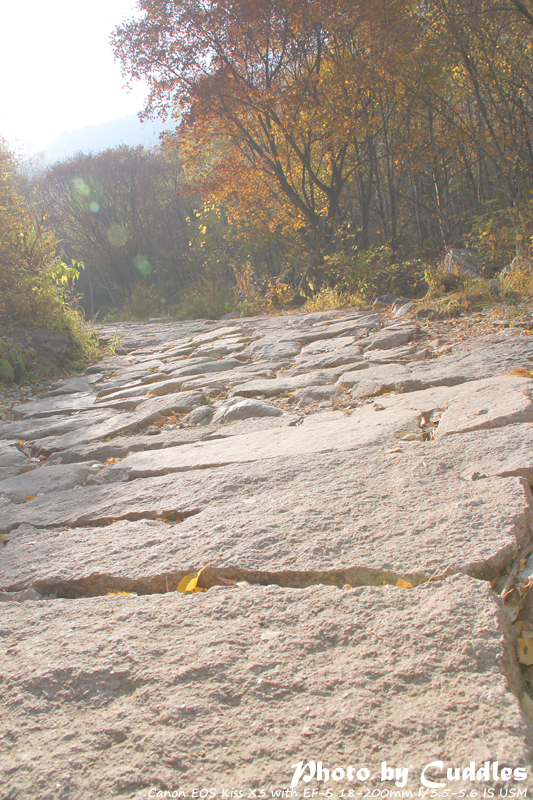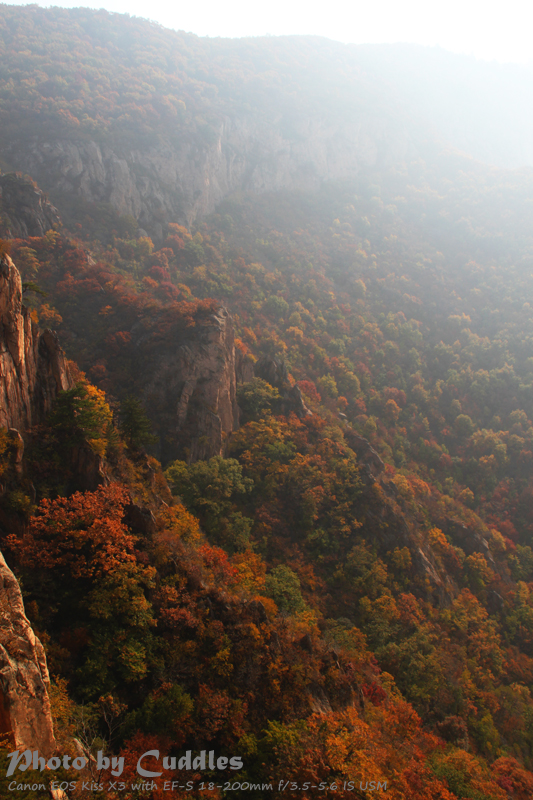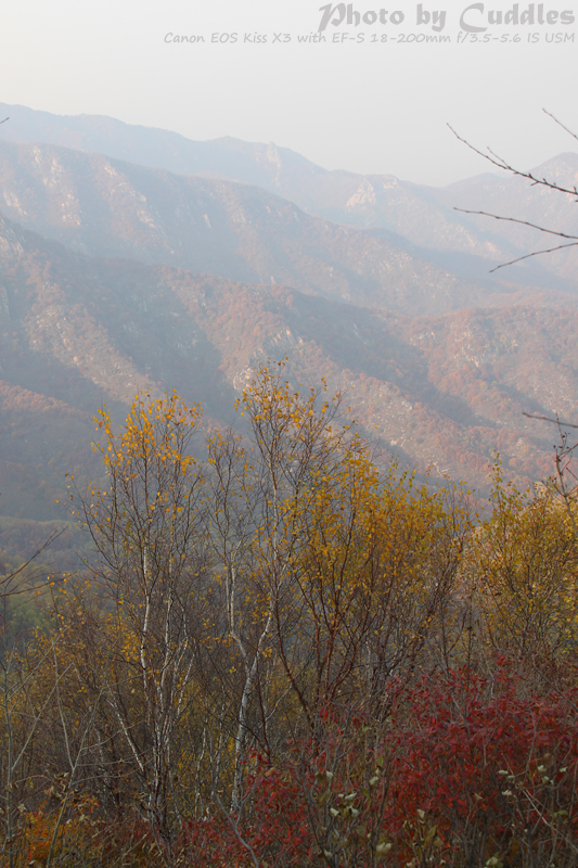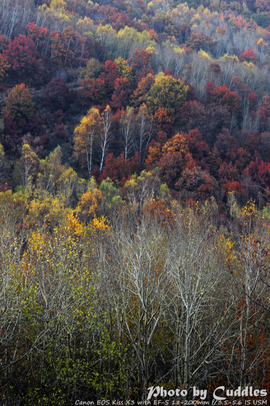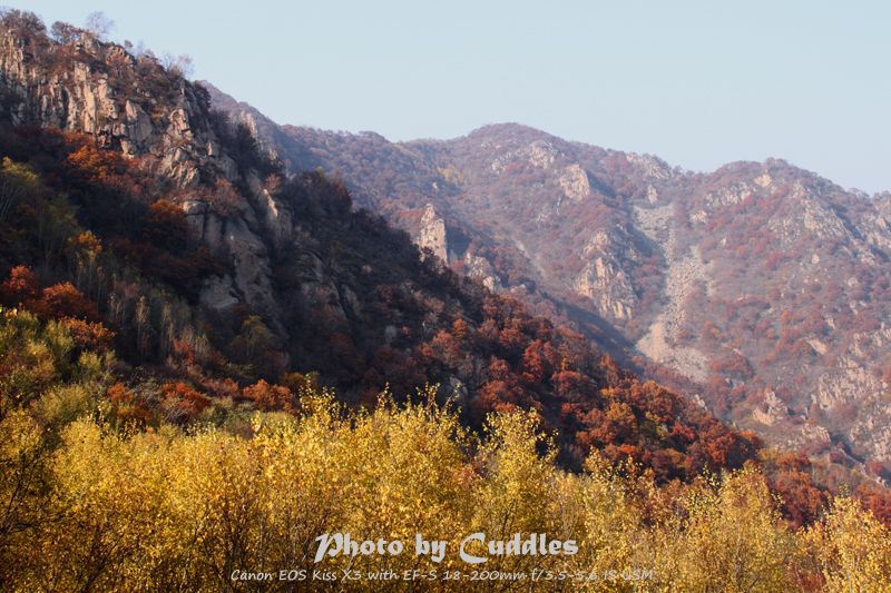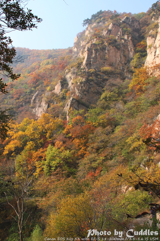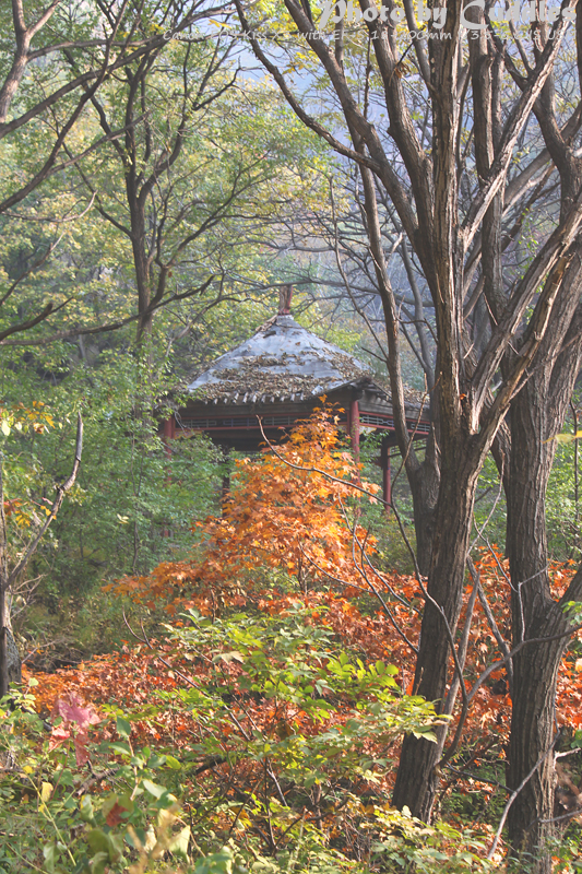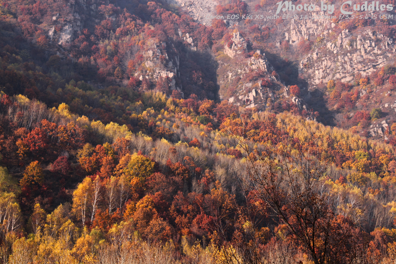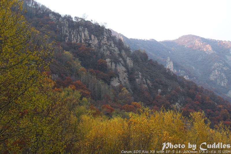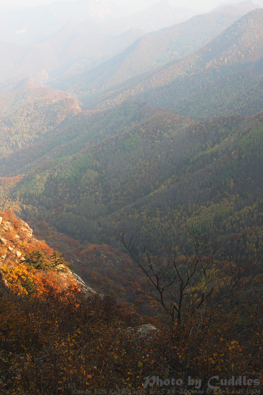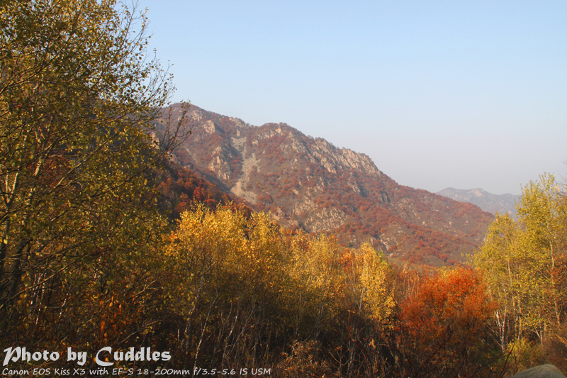 下车后上山进林,已经开始大量的落叶了,但是还是能够感受到很强烈的秋色,估计再晚到一周就差很多了。尤其是攀爬到一定的高度,俯瞰群山一派秋色,真是心旷神怡啊。这里不多说了,只有亲眼所见才能体会。上山建议不要单纯以登上南猴顶为目标,要充分考虑时间因素。山里天黑得异常的块,当你意识到太阳下山了,天会迅速的黑下来。所以要预留充分的下山时间。