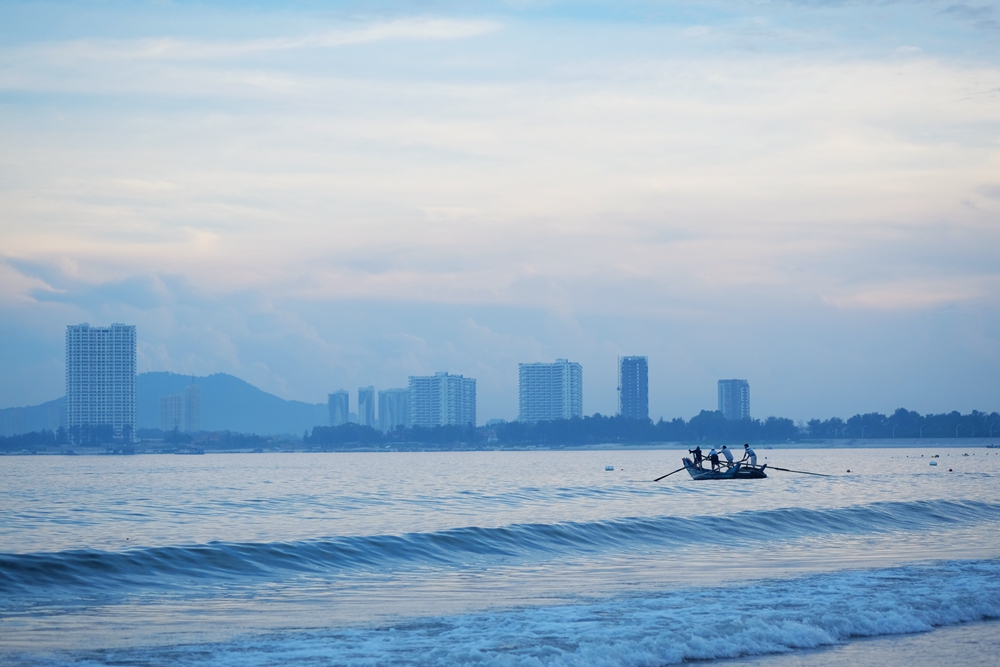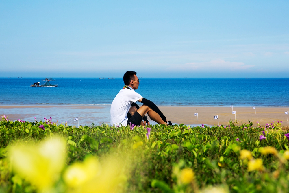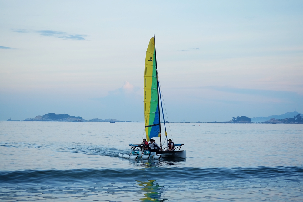 因为这次旅行计划是三天两晚,所以离公寓远一点的金銮湾、苏峰山都不在规划的线路之中。刚到东山岛的时候已经是当天下午了,吃了东西后休息片刻,等到了四点多的时候,温度有所下降才骑着电单车朝马銮湾出发。马銮湾之所以叫马銮湾,是因为海湾上有个马銮村;马銮村之所以叫马銮村,是南宋末代皇帝给取的名字。原来,是落荒南逃的宋帝经过此地,被乞求钦赐村名的,人们拦马挡道,才叫“栏马”,又改“马栏”最后定“马銮”的。如今的马銮湾可以说是东山岛最热闹的沙滩,因为这里不但是国家级健康海水浴场,还是国家帆船帆板训练基地。