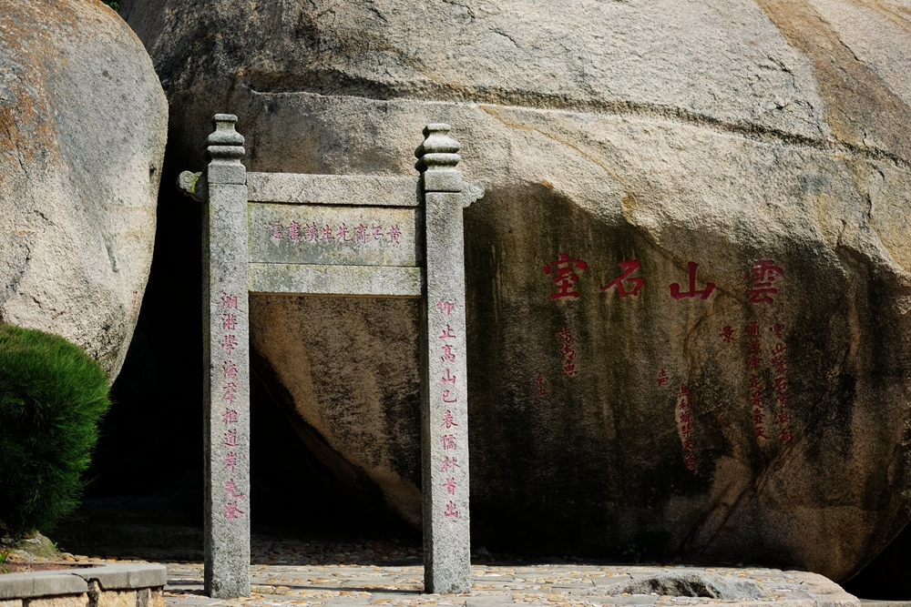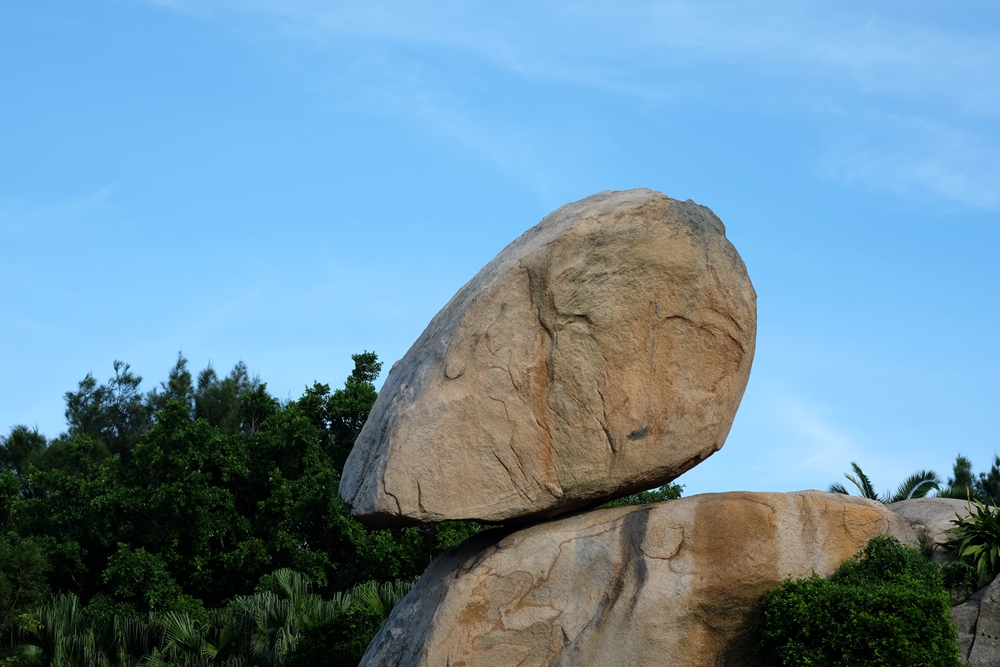 来到东山,不去看看风动石,那就等于白来了。东山的风动石因其“奇、险、大” 的特点而被载入《中国地理之最》,誉为“天下第一奇石”。风动巨石耸立在陡崖上,高4.37米,宽4.47米,长4.46米,重约200吨,上尖底圆,状似仙桃,巍然“搁”在一块卧地凸起且向海倾斜的磐石上,两石的接触面仅为十余平方厘米。狂风吹来时,巨石轻轻摇晃不定,人若仰卧盘石上,跷起双足蹬推,巨石也摇晃起来,但又不会倒下。