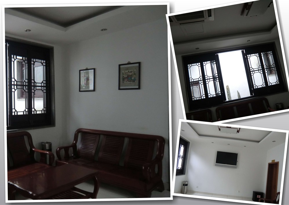 沙发、茶机、电视、空调以及各种摆设一应俱全——洗手间