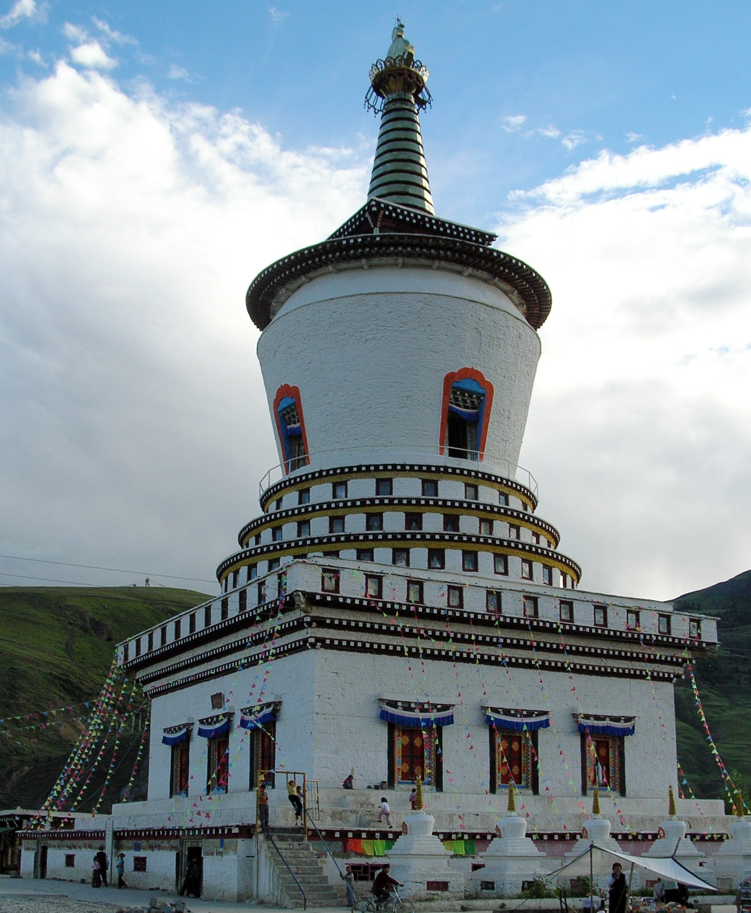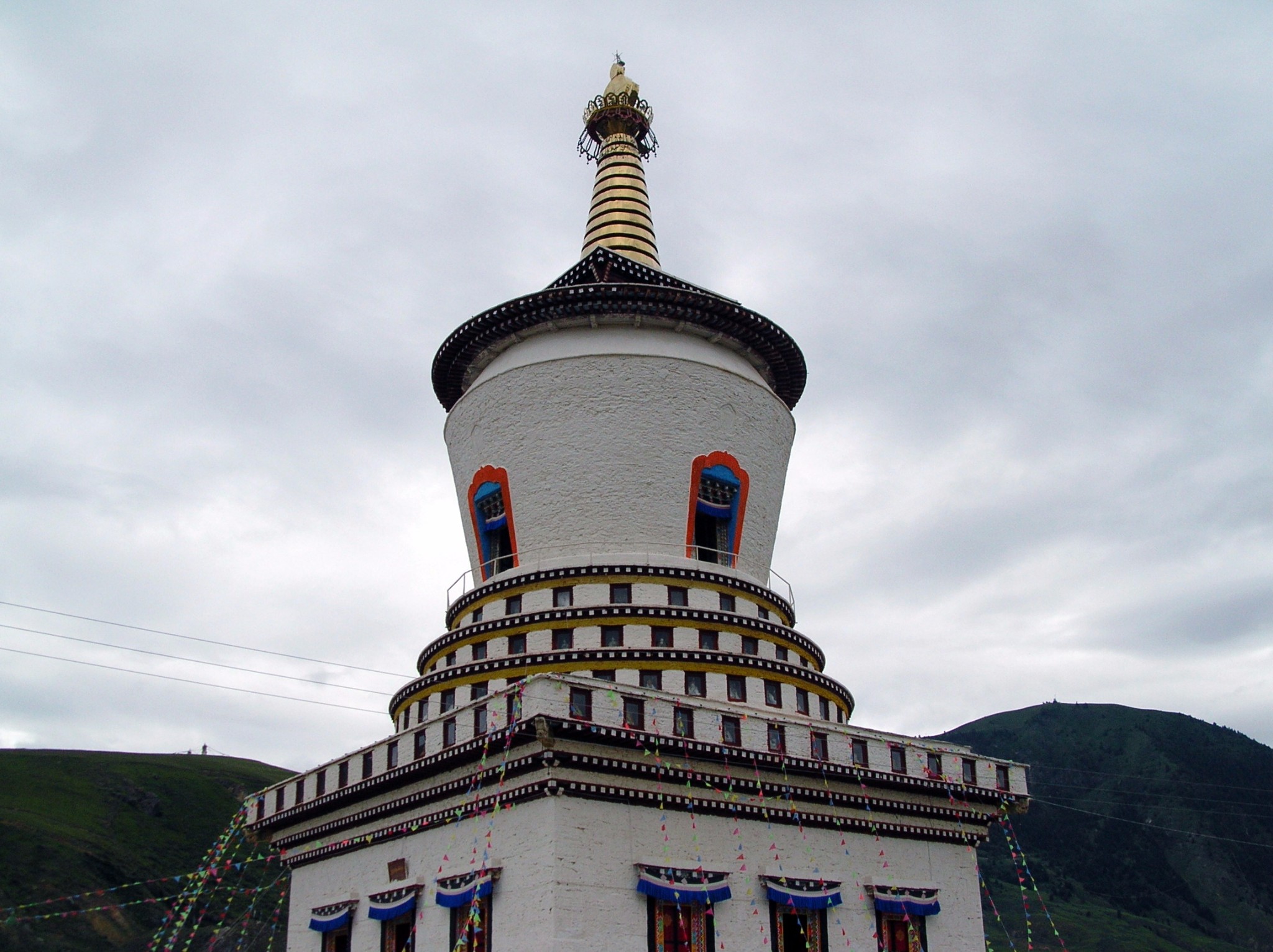 胜利塔是藏区最高的白塔,白塔建成后,灵雀寺的许多法事也都挪到这儿举行。这时候正举办商品交易会,四里八乡的人都赶来了,塔外的空地上搭了不少帐篷,人来人往,熙熙攘攘的好不热闹。