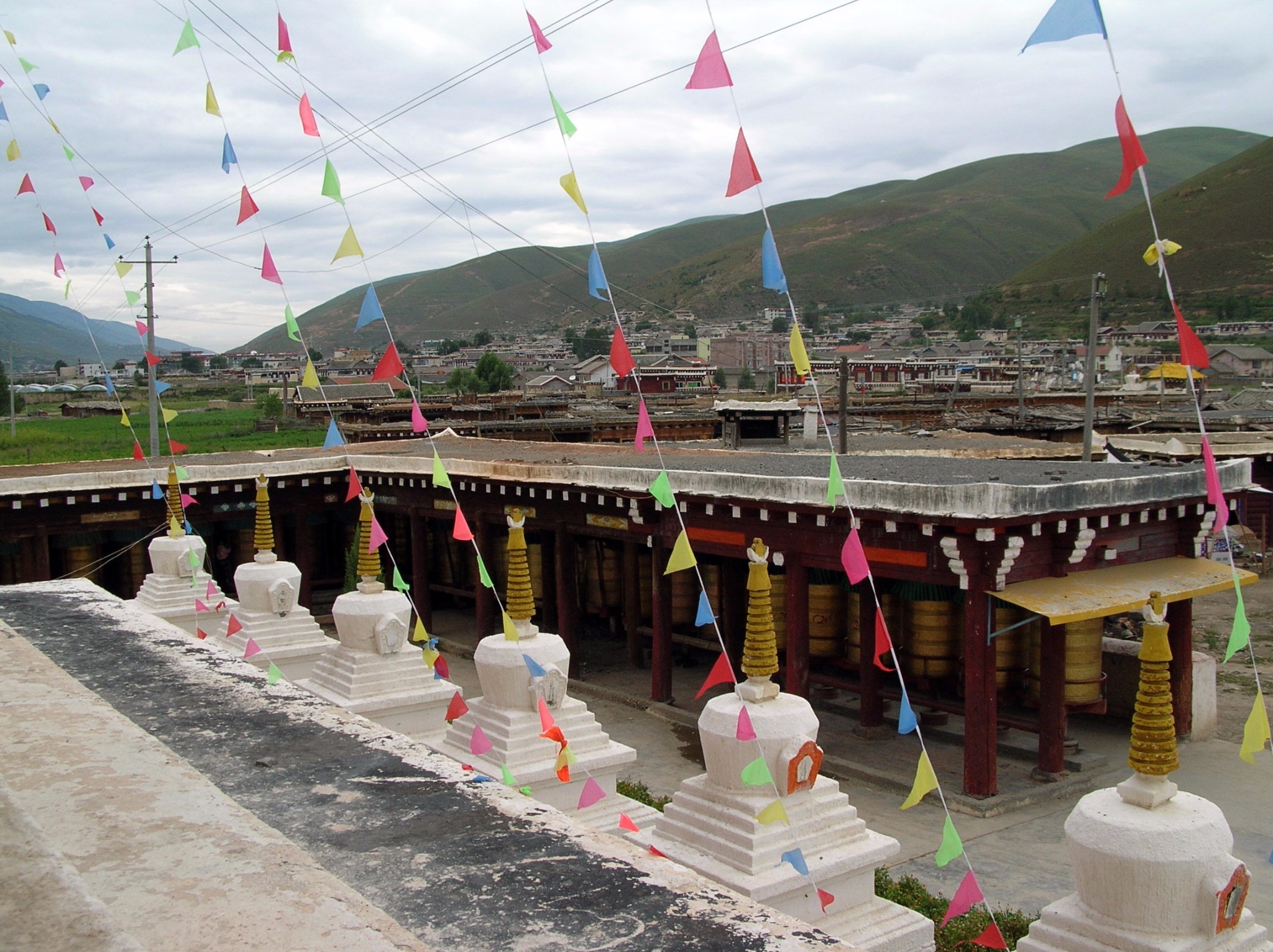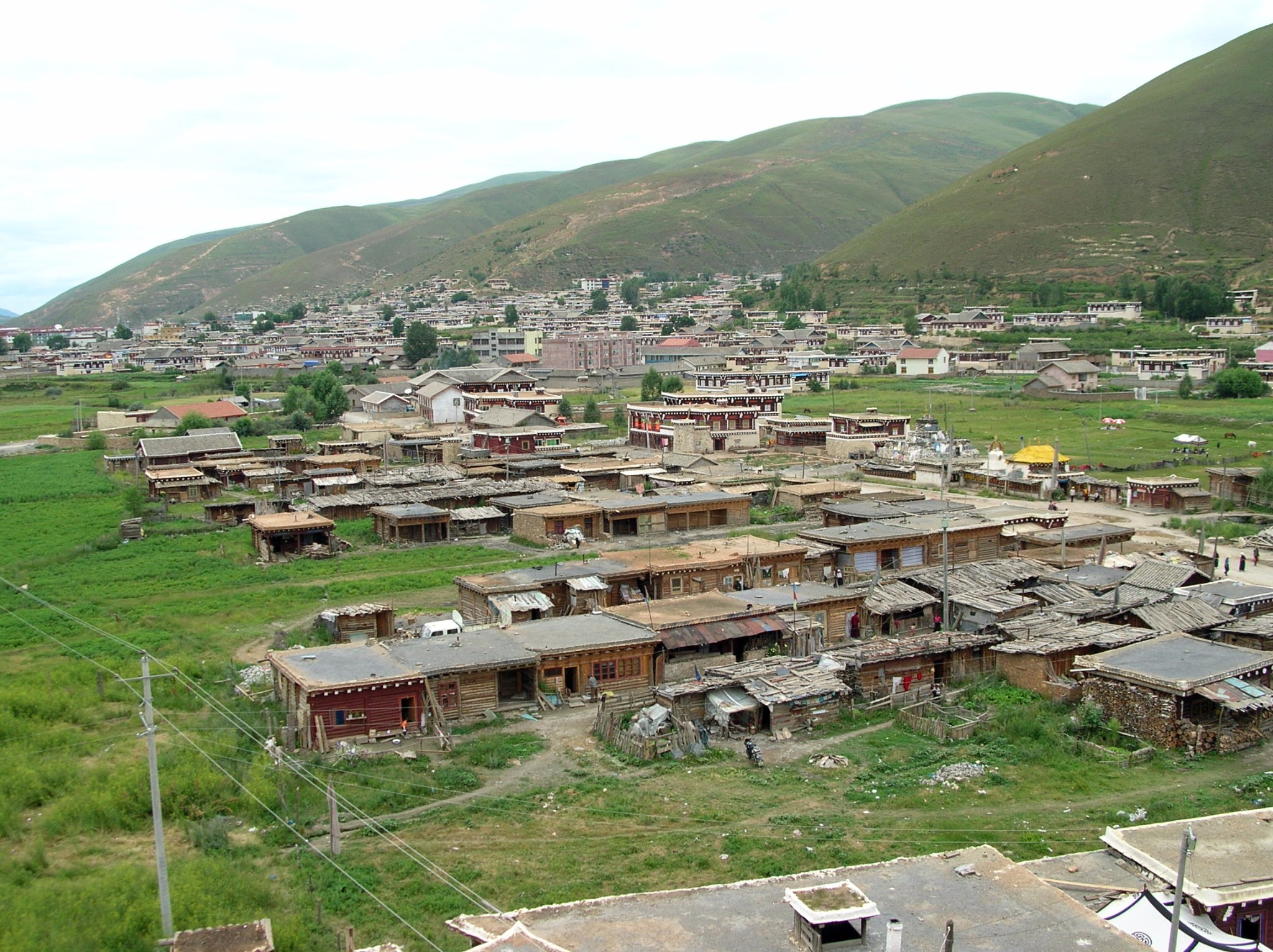 胜利塔顶是鸟瞰道孚民居全景的好地方。蓝天下,鳞次栉比的民居由近到远一直延伸到平缓的山坡上,与远山、碧草交相辉映。