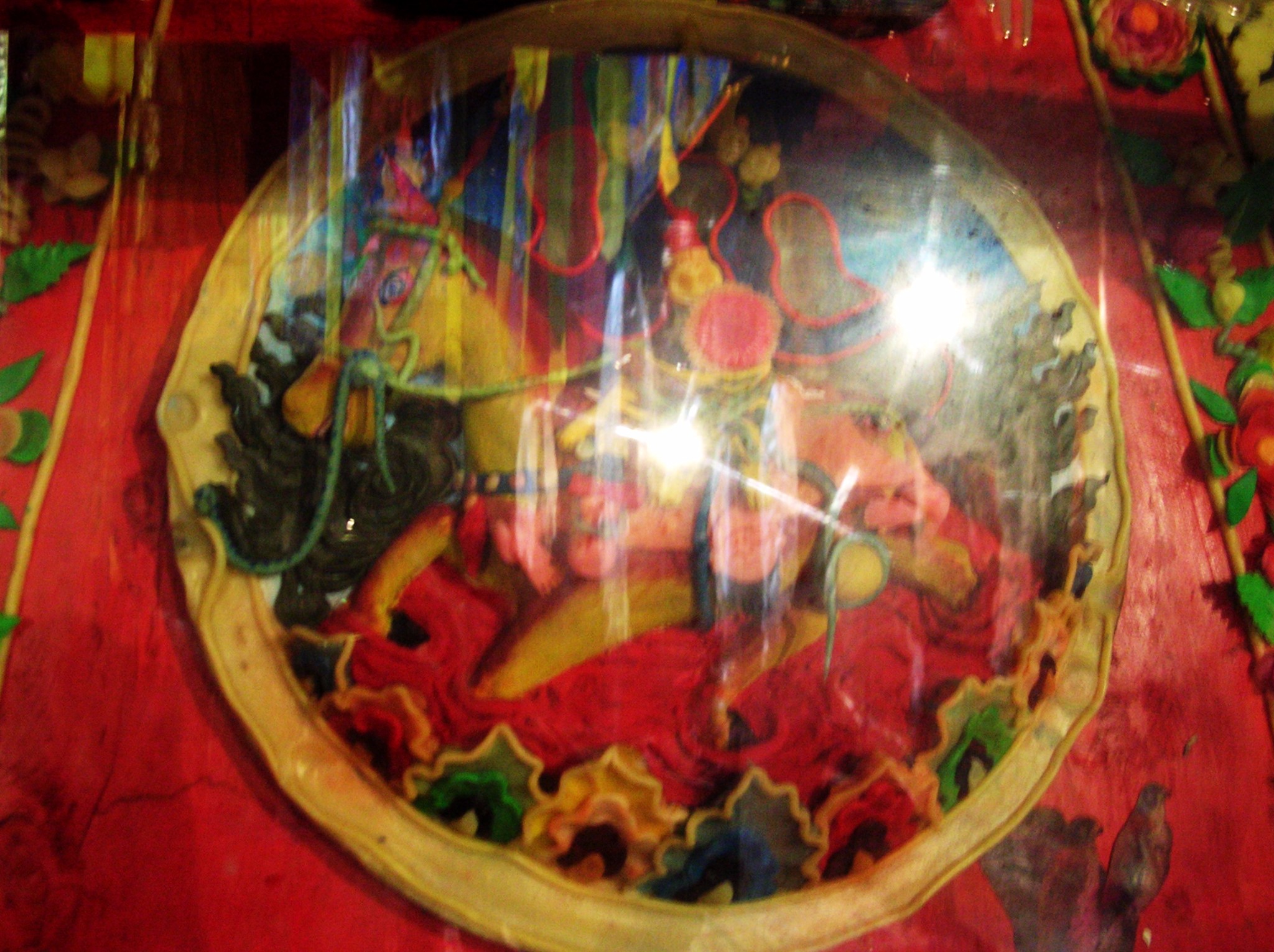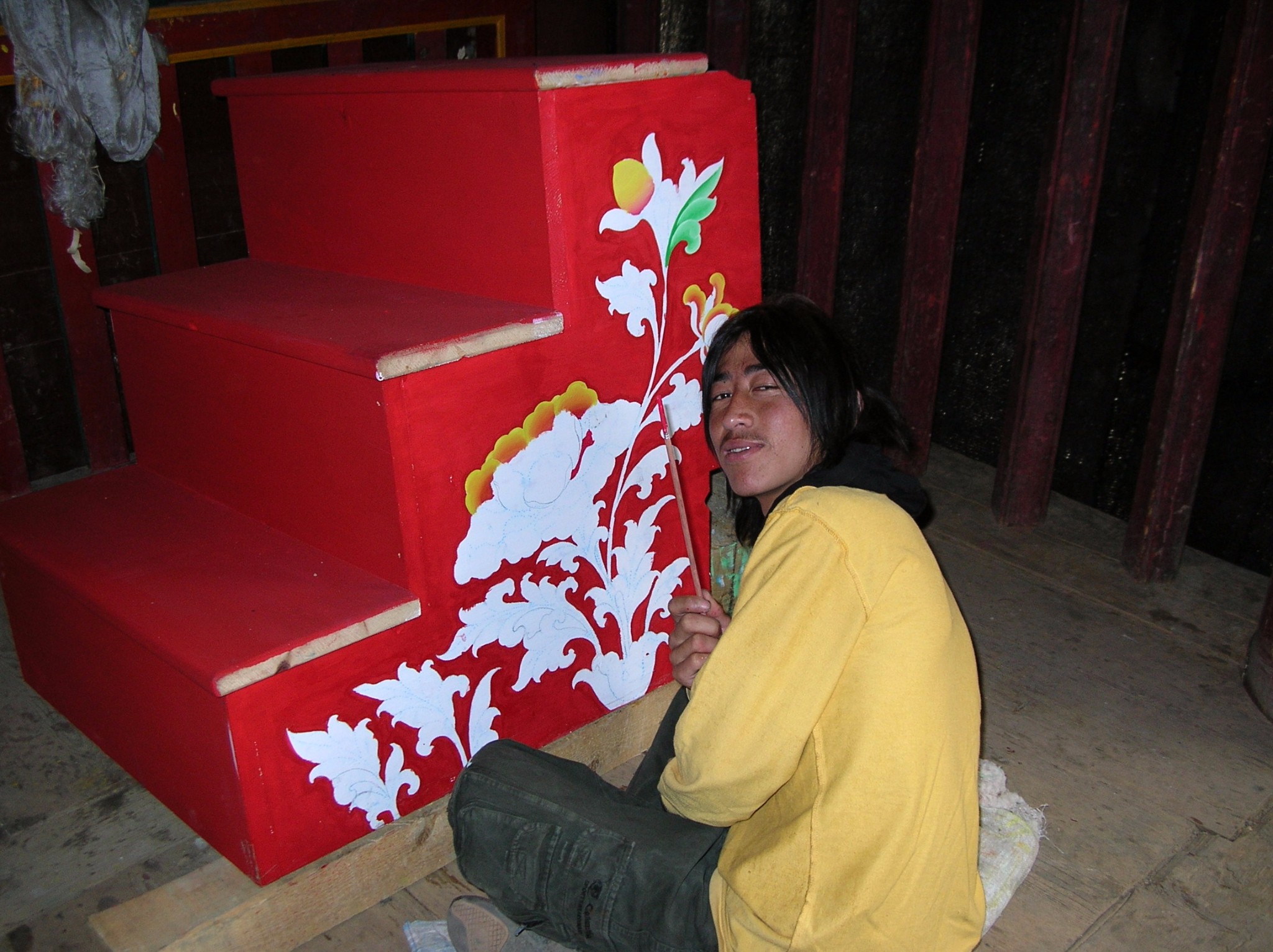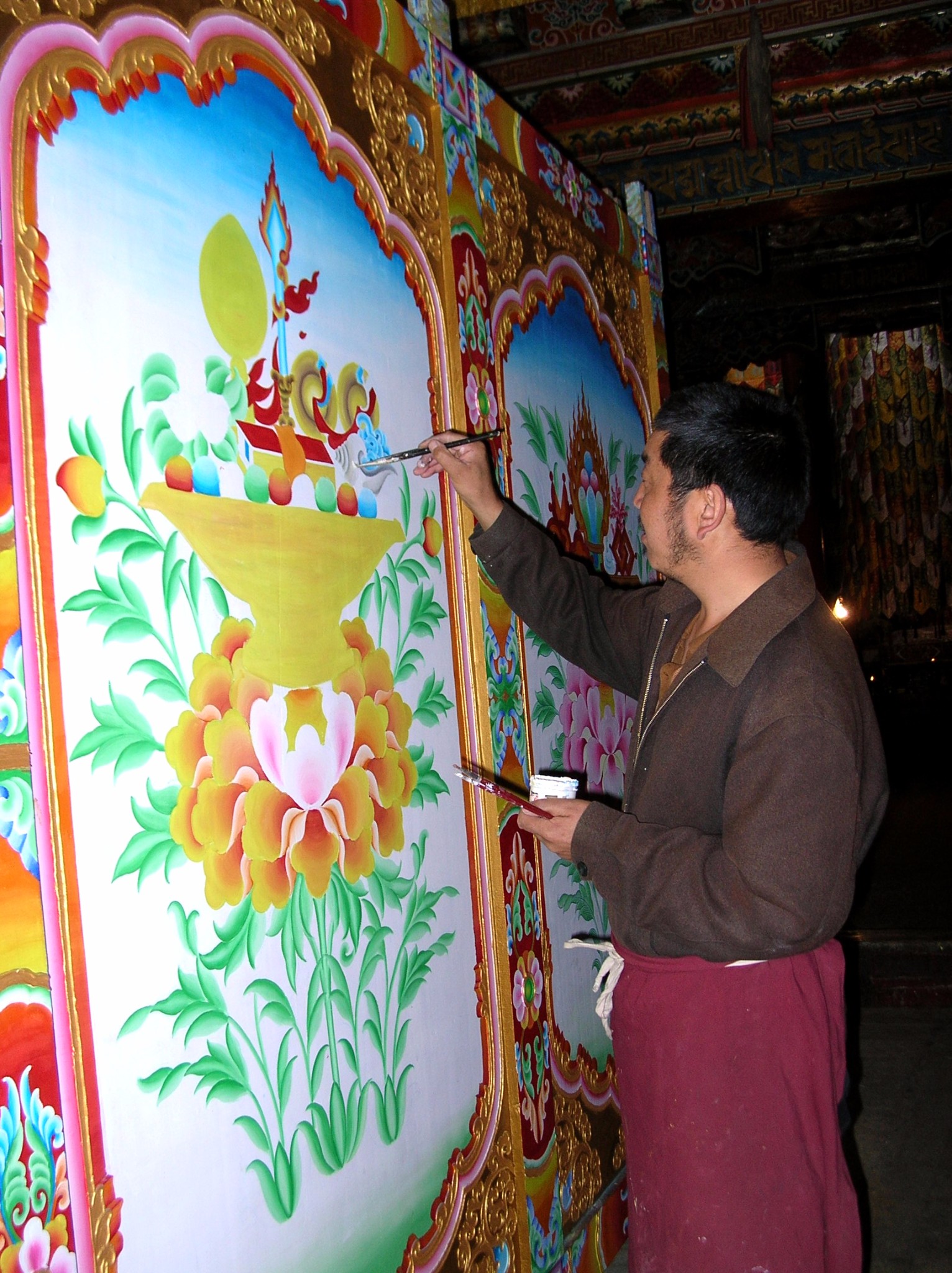 我去参观的时候,看到寺里正请匠人打造佛龛,有几个工匠在做彩绘,看到他们用口水润笔,唇齿之间搞得五颜六色,问之,说:习惯了,方便。其实长期这样肯定对身体是有害的,但愿他们的虔诚能感动上苍,能保佑他们身体健康。