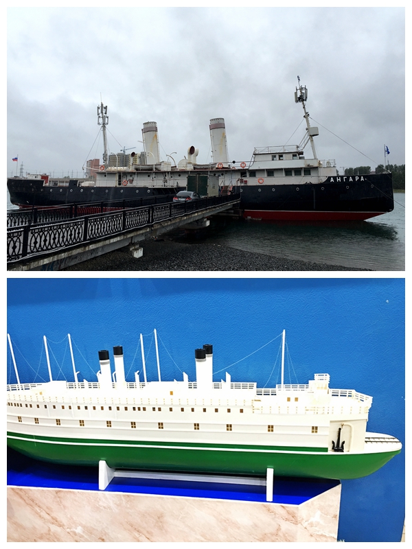 刚刚到安加拉河破冰船边上,雨就下了起来。上图为河边退役的破冰船与贝加尔湖博物馆里的破冰船模型。