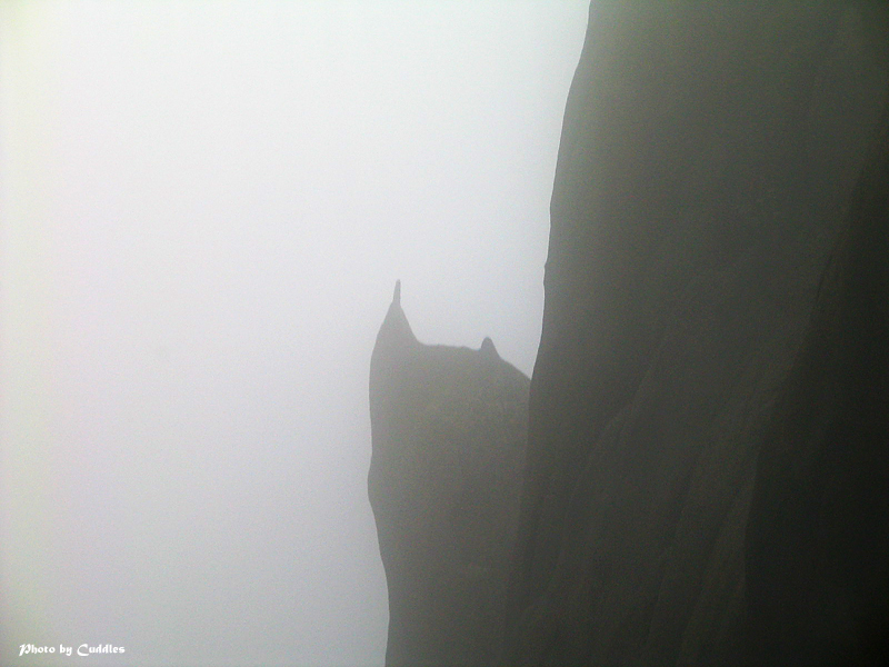 终于我们登上了莲花峰顶,那是多么小的一个平台,然而山下却还有那么多的人想上来。四周雾气蒙蒙,我想我们可能在云里面,其实也看不到太远,但确实如置身仙境。