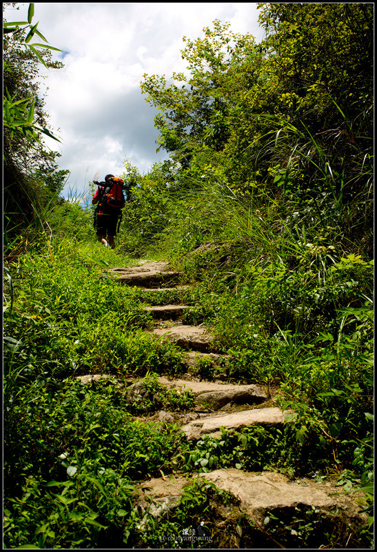 折回20分钟,才与公盂村赶来的柯向导(花T妇人的弟弟)会合了。原来,在公盂村不远处果真有一条岔道,岔道口有一块巨大的岩石,走上岩石后才有一道小径显现出来。