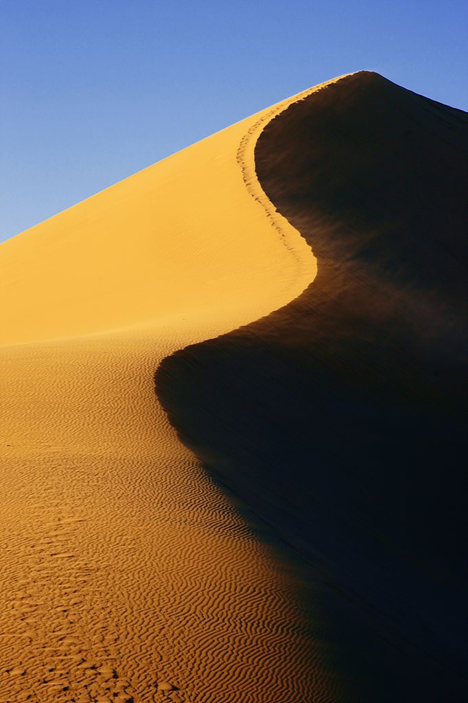 巴丹吉林 沙漠,位于我国内蒙古自治区阿拉善右旗 北部,雅布赖山以西、北大山以北、弱水 以东、拐子湖以南。面积4.7万平方公里,是我国第三大沙漠. 其中西北 部还有1万多平方公里的沙漠至今没有人类的足迹。海拔高度 在1200-1700米之间,沙山相对高度可达500多米,堪称”沙漠珠穆玛峰”。地质构造 上属阿拉善 地块,地貌形态 缓和,主要为剥蚀低山残丘与山间凹地相间组成,第四纪沉积物普遍覆盖于地表,形成广泛分布的戈壁 和沙漠。处阿拉善沙漠 中心,气候干旱,流动沙丘 占沙漠面积的 83% ,移动速度较小 。中部有密集的高大沙山,一般高200 ~ 300 米,最高的达 500米。以复合型沙山为主,为北 30°~40°东方向排列,系西北 风的强大影响所致。高大沙山的周围为沙丘链,一般高20~50米。沙丘和沙山上长有稀疏植物,西部以沙拐枣、籽蒿、麻黄 为主;东部主要为籽蒿和沙竹,沙拐枣、麻黄等逐渐减少。高大沙山间的低地有144个内陆 小湖,主要分布在沙漠的东南部。由于蒸发强烈,湖泊积聚大量盐分 ,边缘生长芦苇 、芨芨草等 ,为主要牧场。有些湖盆边缘有淡水泉出露,为治理沙漠 提供了条件。巴丹吉林 沙漠平均每10平方公里不到1人。在整个沙漠内部,仅有巴丹吉林庙 和库乃头庙两大居民点。基本无种植业。全部经营牧业,骆驼 为该地主要家畜,数量居中国各旗县之冠;次为山绵羊 。沙漠内部无固定道路,横穿腹部异常困难,中部及东北 部基本为无水区。东南部的雅布赖盐湖盛产食盐,西部的古鲁乃湖及巴丹吉林 庙附近一些湖泊内有碳酸钠的沉积。