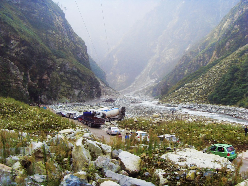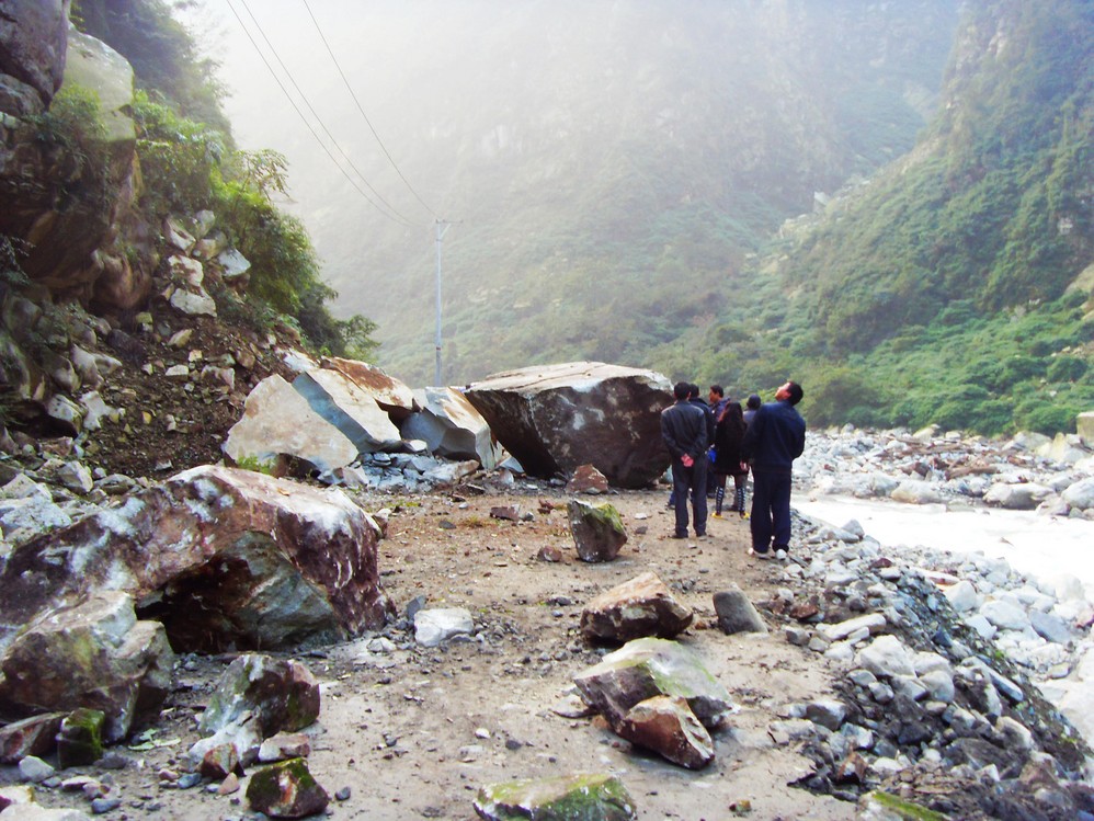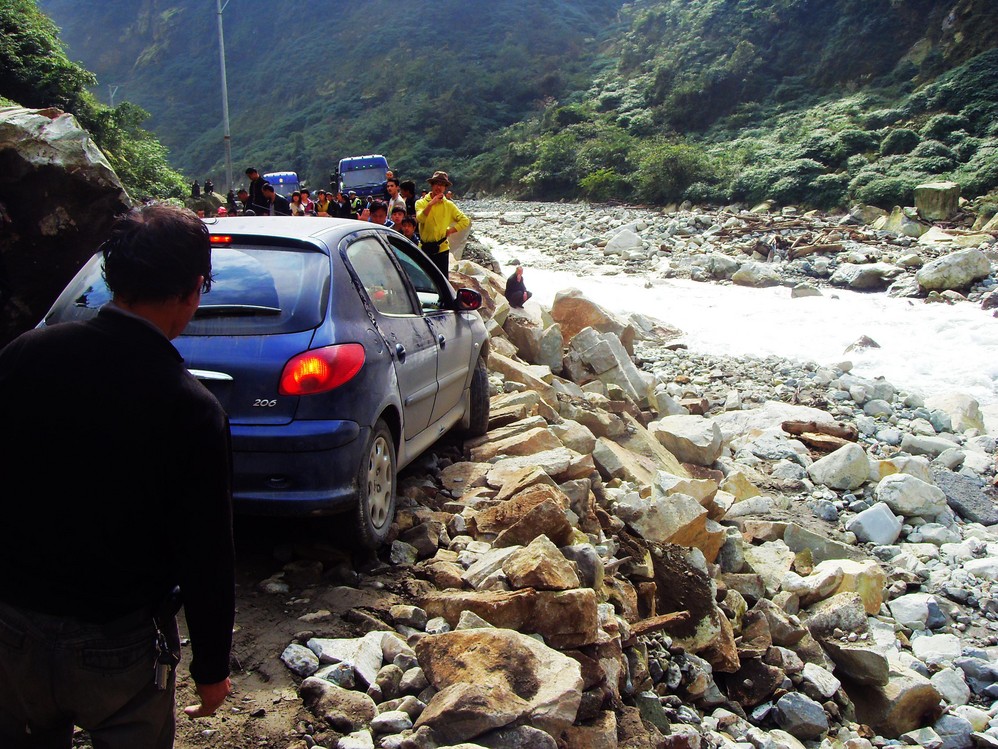 早上8:30分交警来,终于看到希望了,重来没觉得交警那么可爱过。很多人早上直接步行出去了,好像都习惯了样。21:00挖挖机还没来,有人等不急了,各自拿起五花八门的工具把小点的落石打碎,铺在河崖边,再次验证了“人定胜天”,铺好的道很窄刚刚可以过小车,老友凭着过人的胆识,娴熟的技术,在众人“左右左”的指挥声中顺利通过。看的我都惊出几滴冷汗。。。