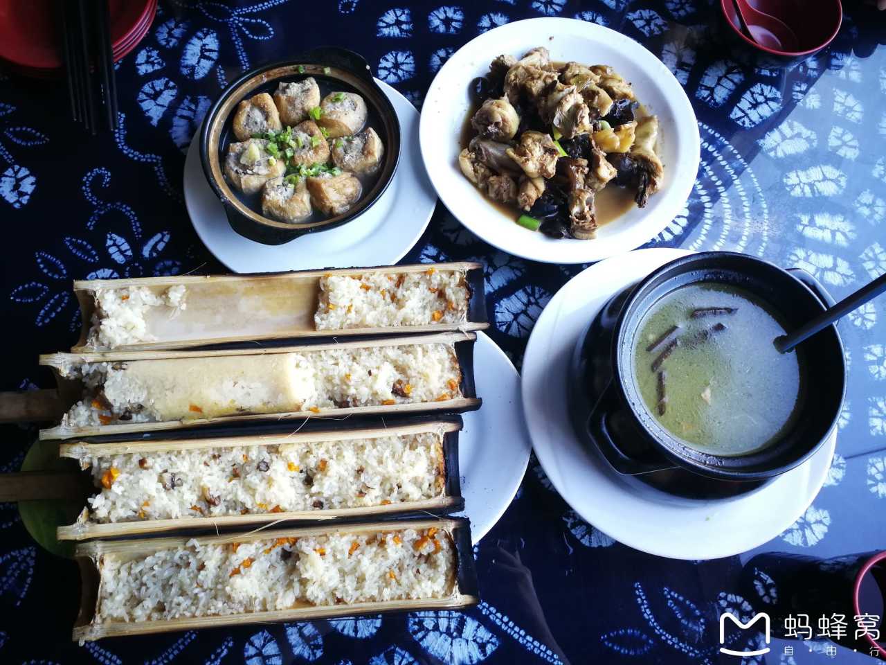 ),四个人点了2份竹筒饭,一份豆腐酿,一只鸡(一鸡两做,一份木耳炒鸡肉,一份鸡汤),价格一共是200多,不算便宜。