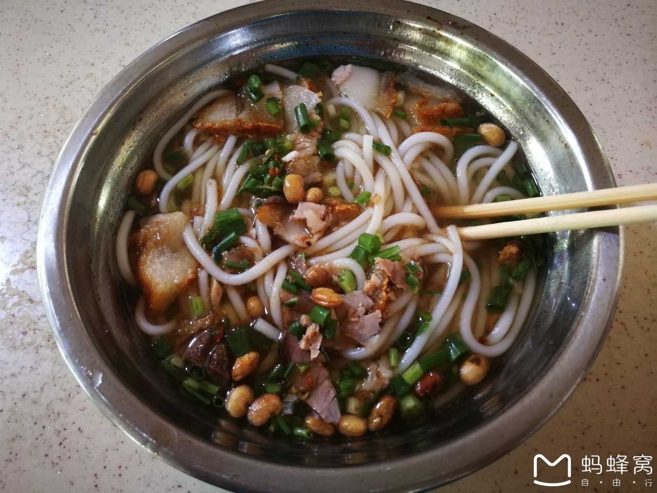 午饭是在桂林市解决的,是在一家名叫“路口村羲和米粉”的米粉店里吃的桂林米粉。这家米粉店招牌已经严重的褪色,店面也隐藏在一个路口中,一般人如果不注意,真的很难发现它。