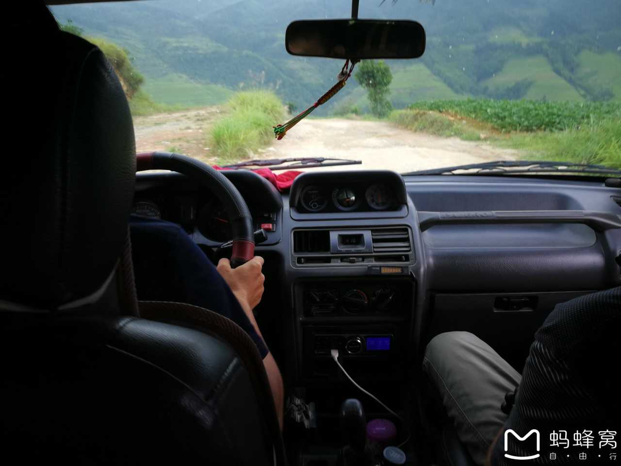 租用一辆越野车的价格一般是在150元,一辆车能坐4-6个人,但一路上山,越野车走的路也是坑坑洼洼,非常的颠簸,甚至可以说是我此生坐过的最颠簸的汽车,全身有种快要被震散架的感觉。(请看下图后视镜上的挂饰,一路上,它的摇晃程度远不止图中的那么轻)。不过花点钱坐车的优点是有的,从景区大门到田头寨,坐车需要20分钟,再从田头寨到全景楼需要40分钟,省了时间,也省了体力。