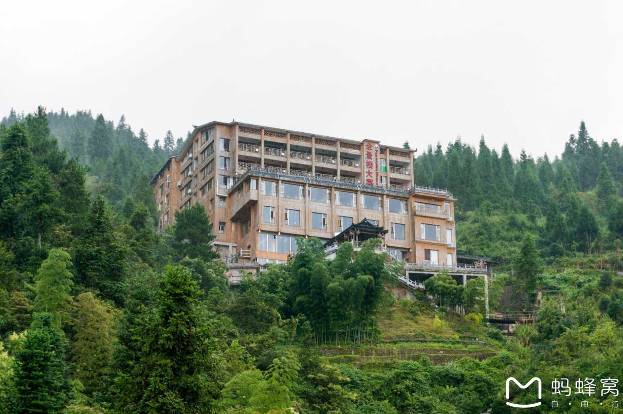话说,我们预定的全景楼是景点中最高的建筑物,去到全景楼的方法有两种,第一种是步行,从景区大门沿路走到田头寨,再从田头寨走到全景楼,快的话,一般两小时就能到达酒店,慢的话就不好说了,如果碰上下雨,一路上的青石板路还是蛮滑的。第二种方法是在景区大门搭乘村民的吉普车绕过大门,走一条村民自建的泥石混合路到达田头寨附近,然后从田头寨步行前往全景楼。