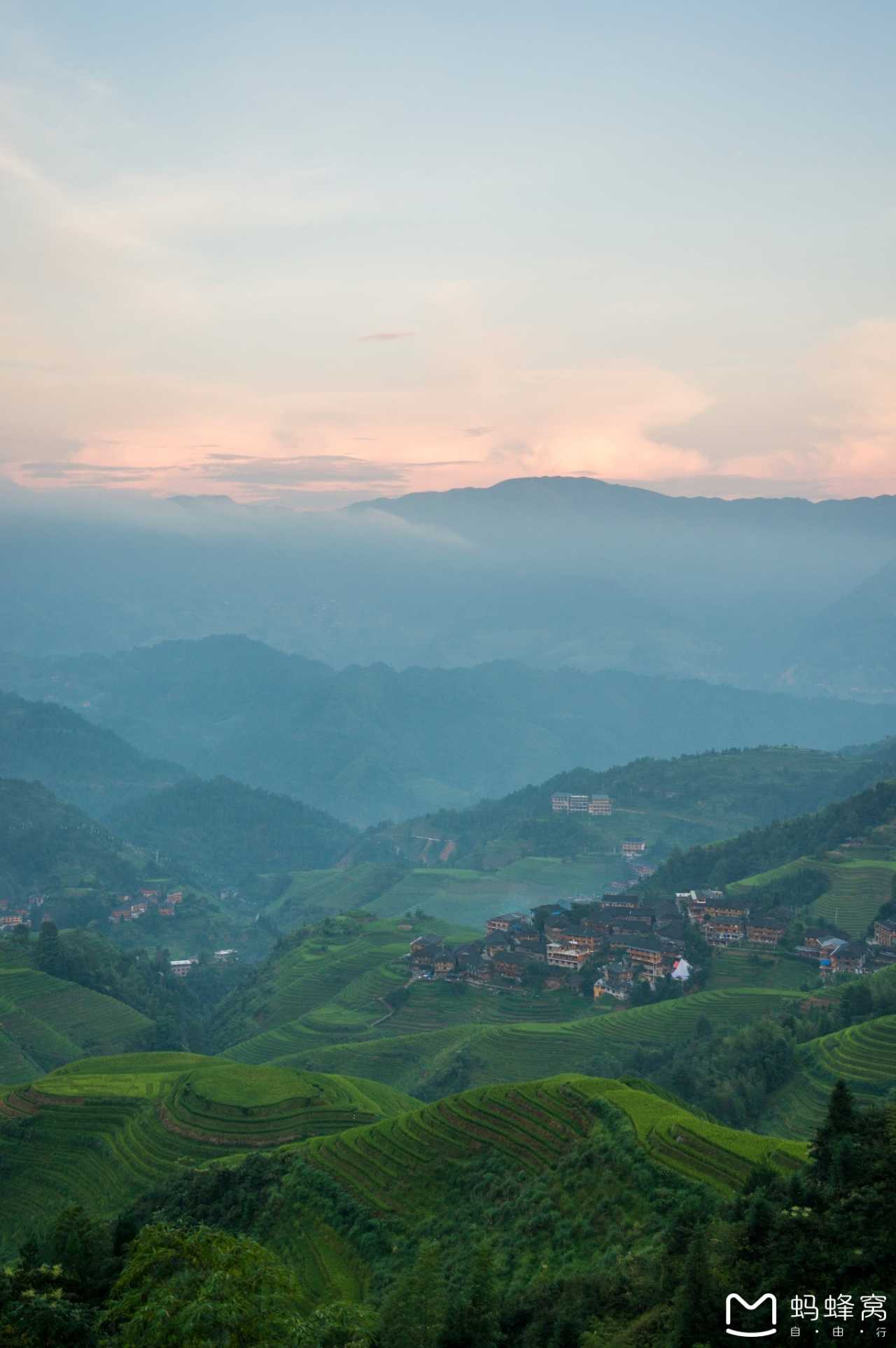 从酒店观景台上观看金坑红瑶梯田的晚霞也是挺不错的,但因为远处山峦雾气大,这次并没能看到一片烈焰红,而是一片淡淡的桔红。不过,就算这样,能看到层峦叠嶂的梯田晚霞也很让人满足,哈哈