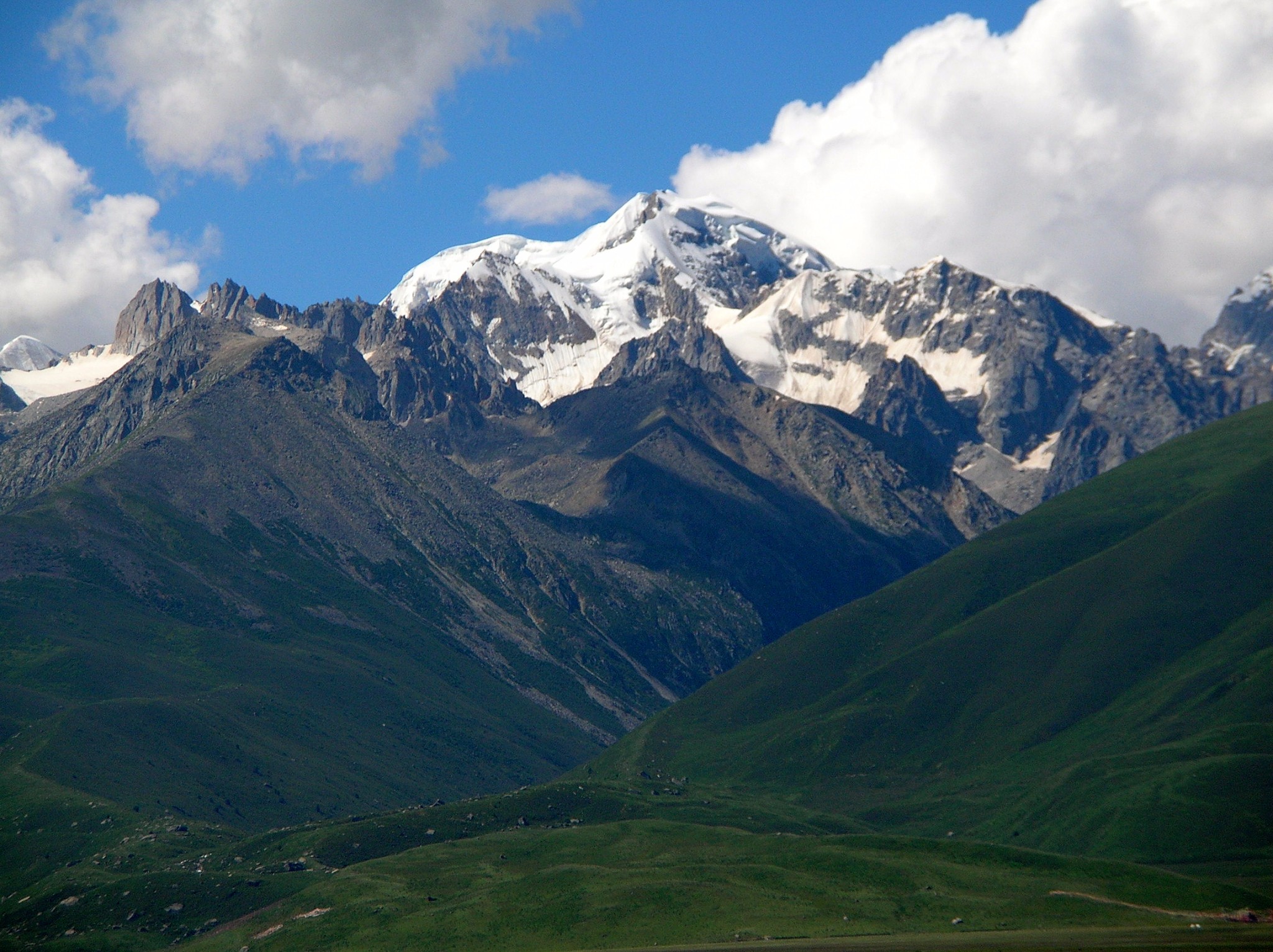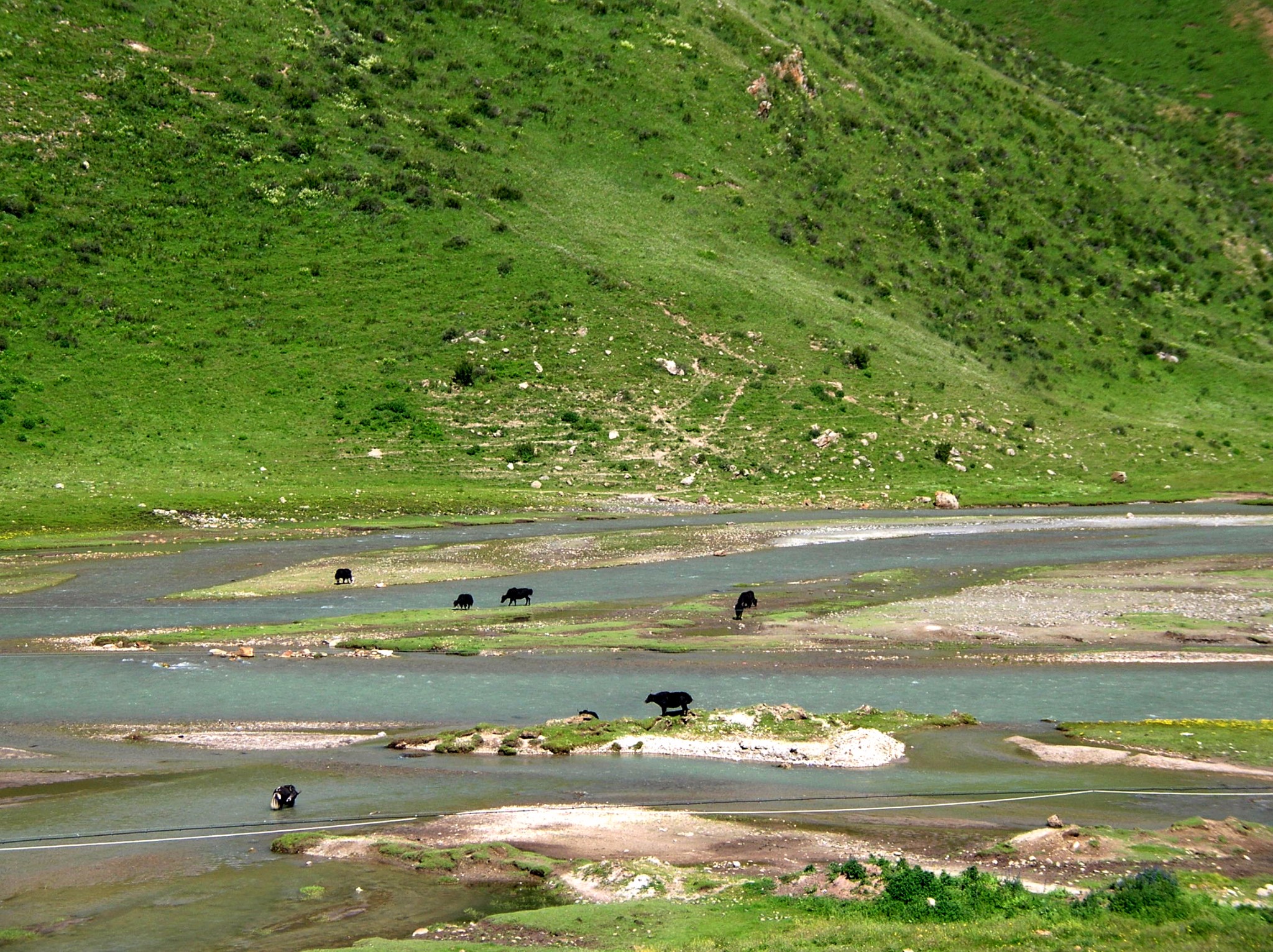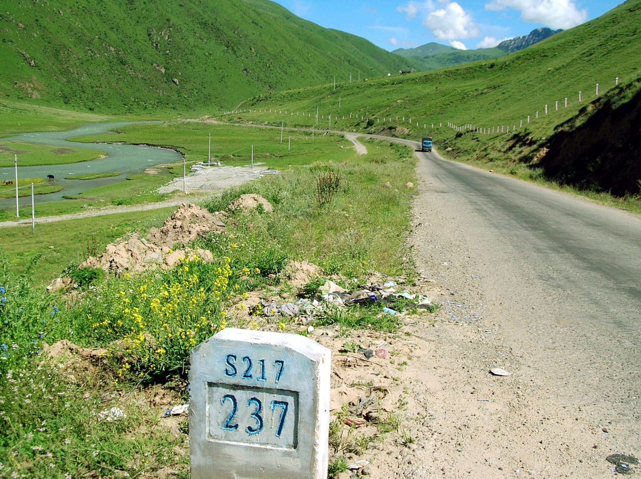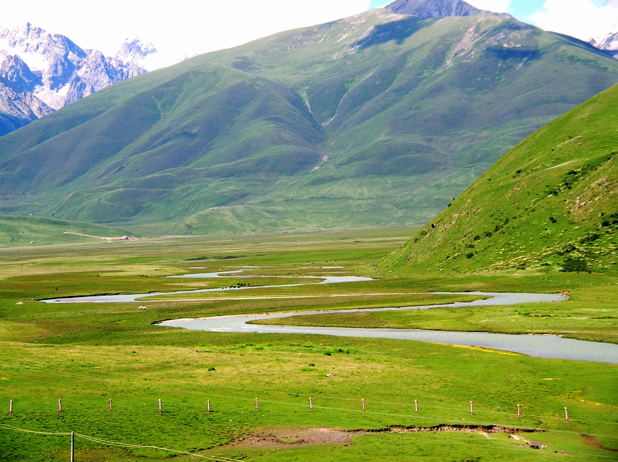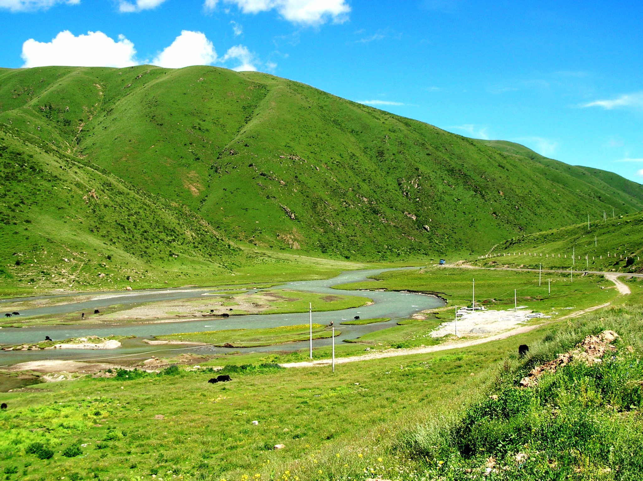 一路上风光奇美。近处茵茵绿草,潺潺溪流,成群的牛羊在悠闲的吃草,远处皑皑雪山,连绵不断,湛蓝的天、白色的云,车子仿佛游走于仙境之中。只可惜,车上拍到的片子都躲不过讨厌的电线杆。