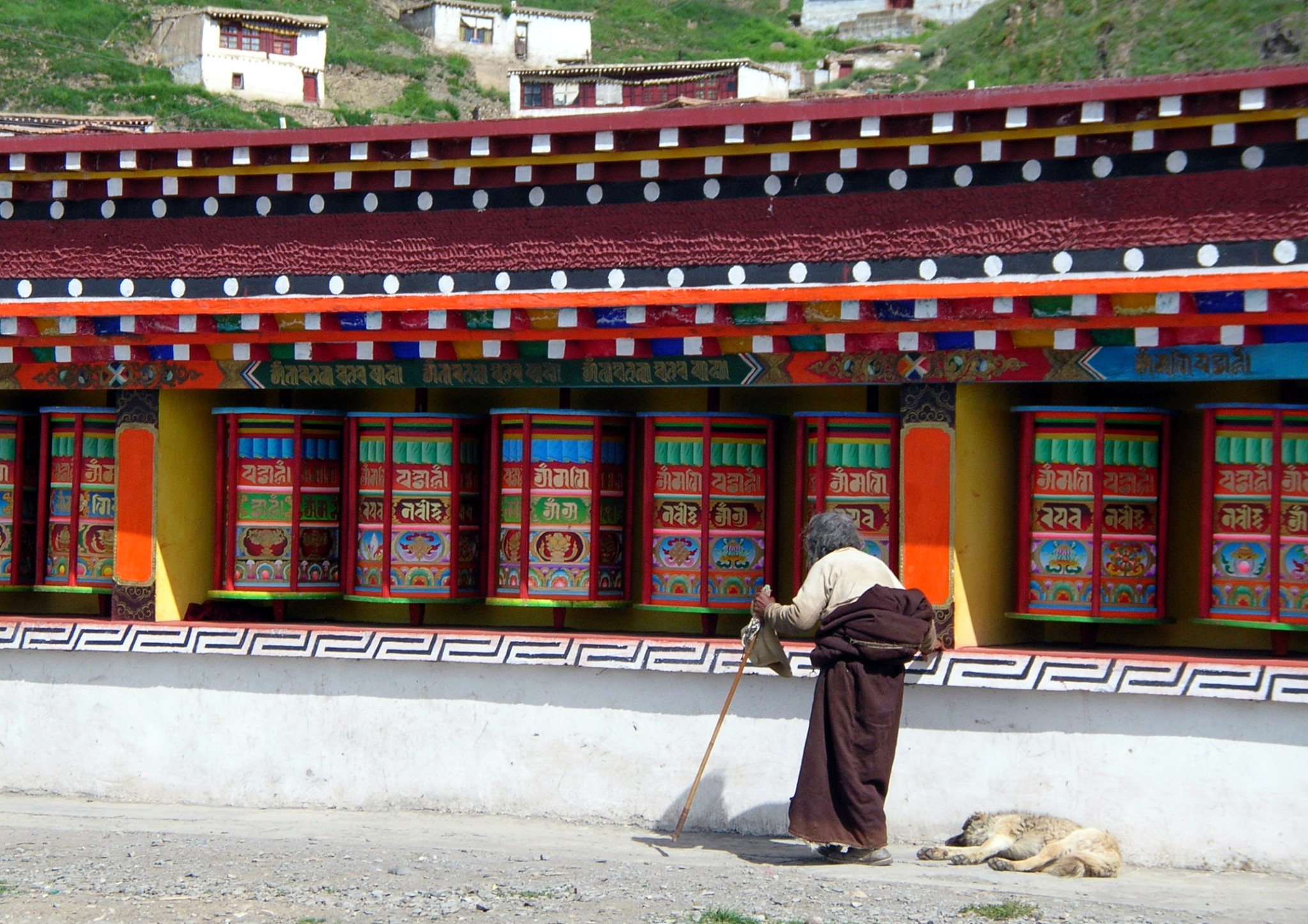 寺庙周围是长长的一溜转经筒,每天来转经的人络绎不绝。