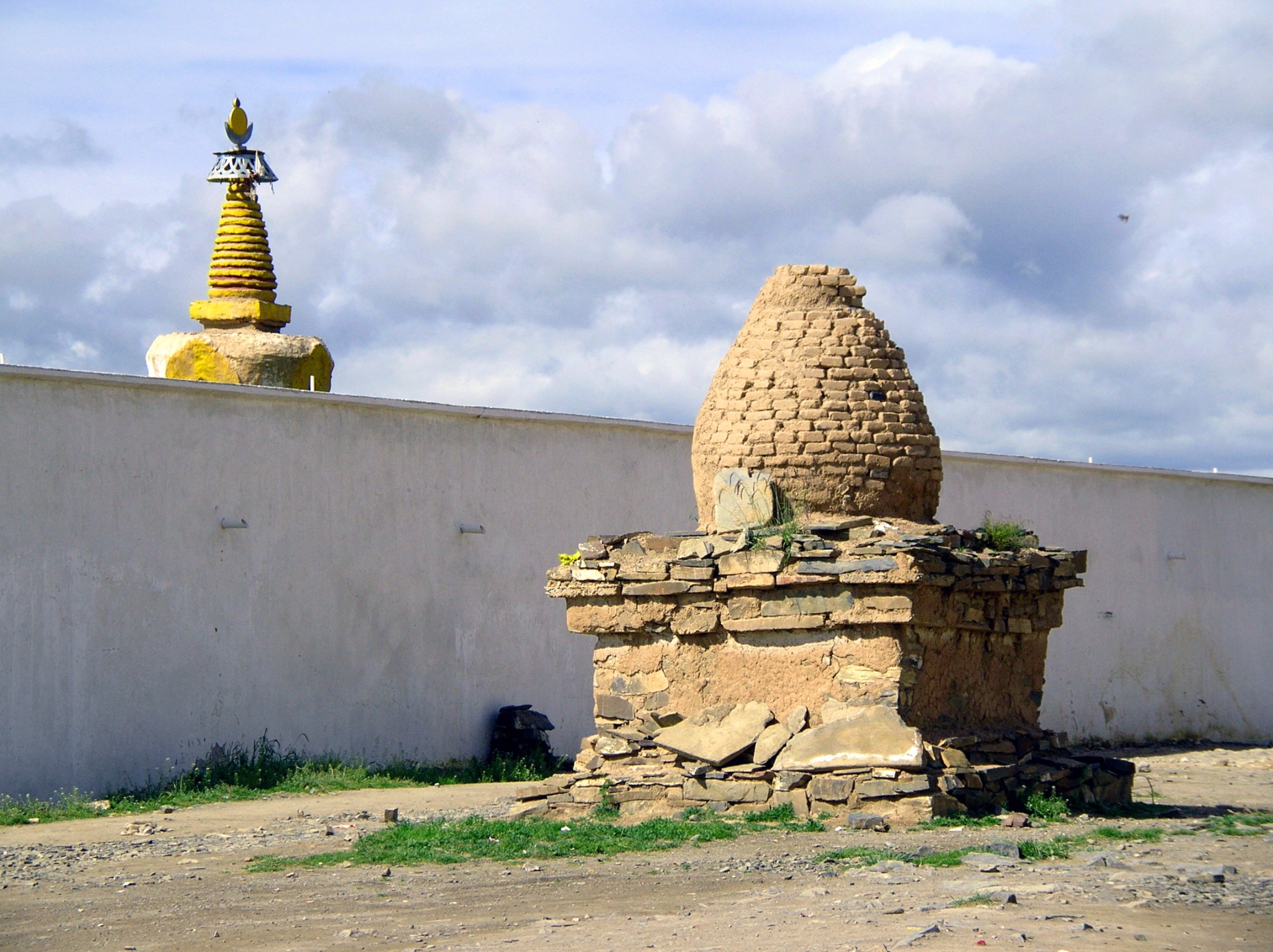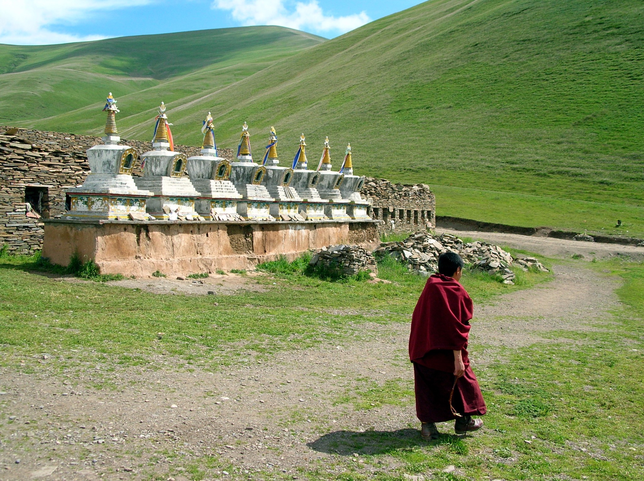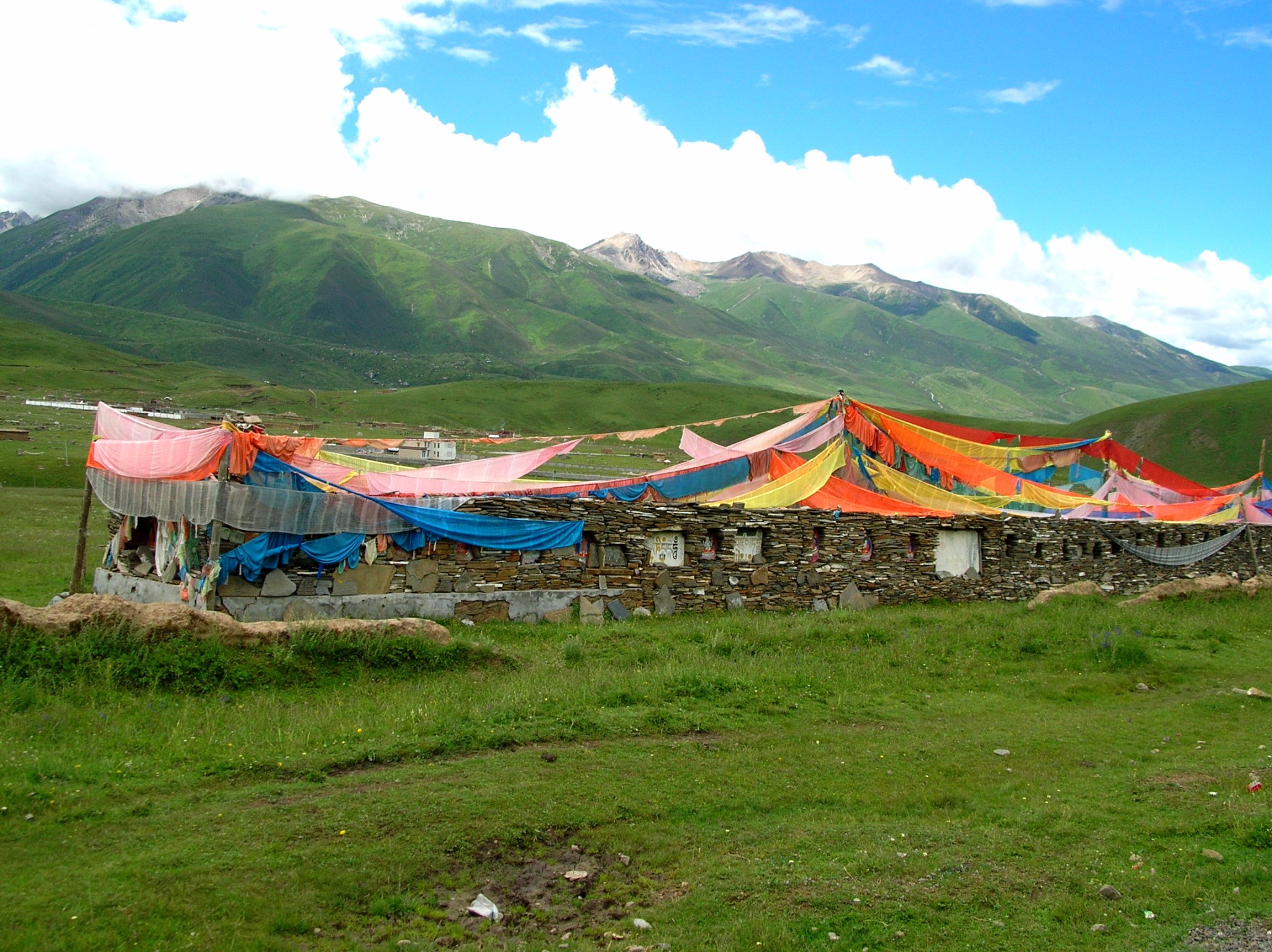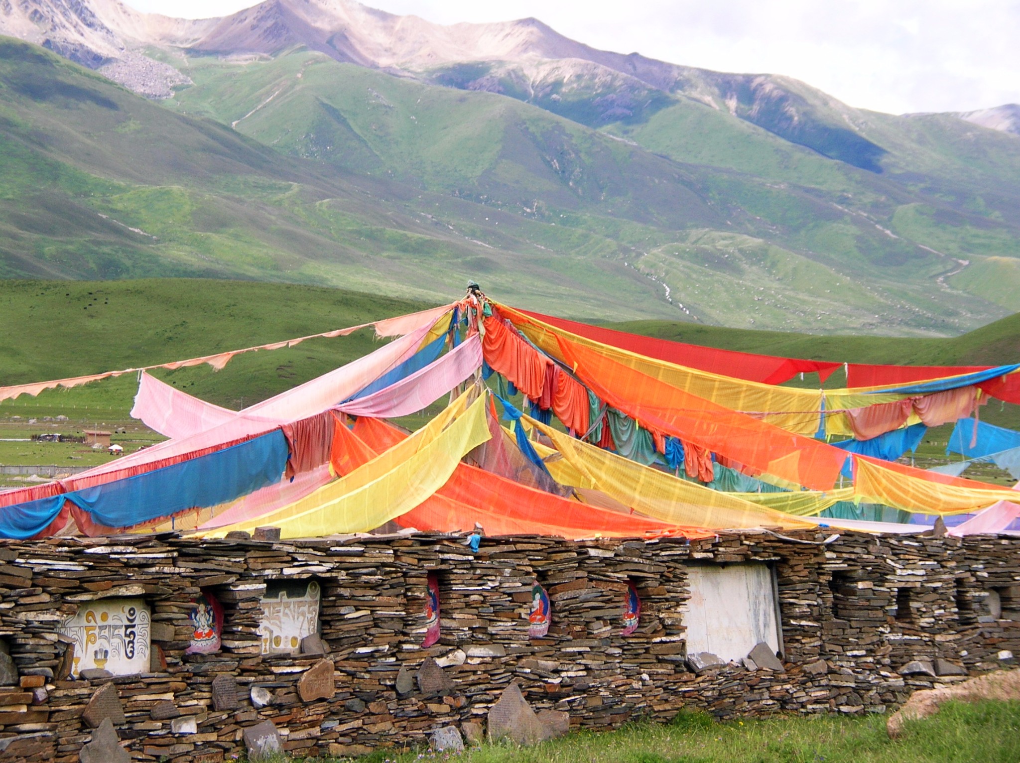 接近马尼干戈时,看到了公路附近的草原上有嘛呢墙,象一条静卧的长龙。嘛呢墙的墙身全部是嘛呢石片堆垒起来的,墙头上挂满了五彩经幡,墙面上镶了很多壁龛,每个壁龛里都摆放了神像和佛像,还有小塔和擦擦。这可都是佛教徒们一块一块从远地搬来垒好的,每片嘛呢石上都刻着六字真言或是佛经,这份虔诚太让人感动啦!