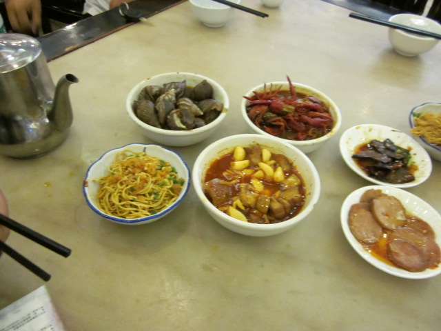 额 郁闷 之前在火车上吃了太多的零食,又担心接下来的车程太长会晕车,所以只点了这么几样,田螺、虾子、哪个神马粉忘了,不过很好吃、熏肺片、毛氏红烧肉。长沙人民幸福指数应该很高,司机大哥介绍说,当地人3-4点的时候一般会来这里喝下午茶。好羡慕。
