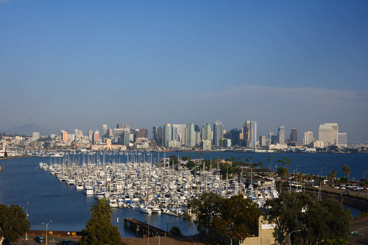 直下圣迭戈,军港城市,民船居多,广厦与帆船,蓝天和碧海,一望无际,尽收眼底。