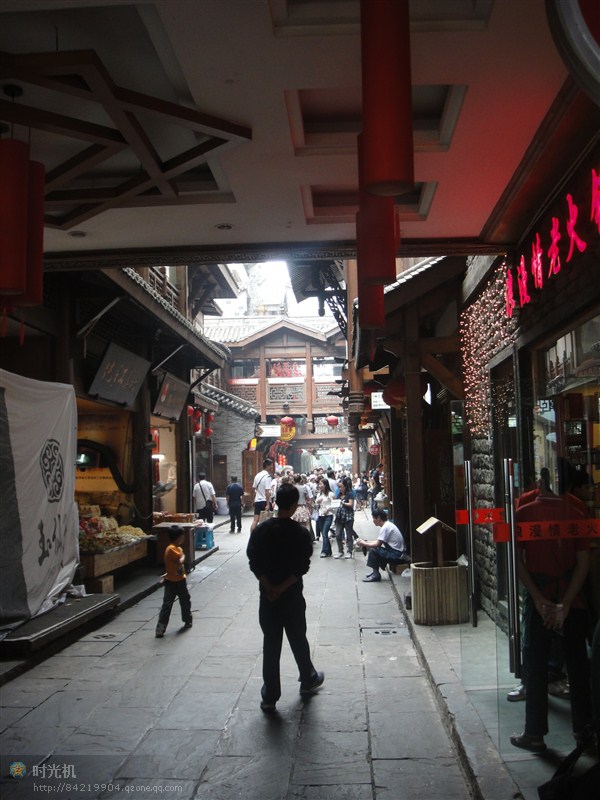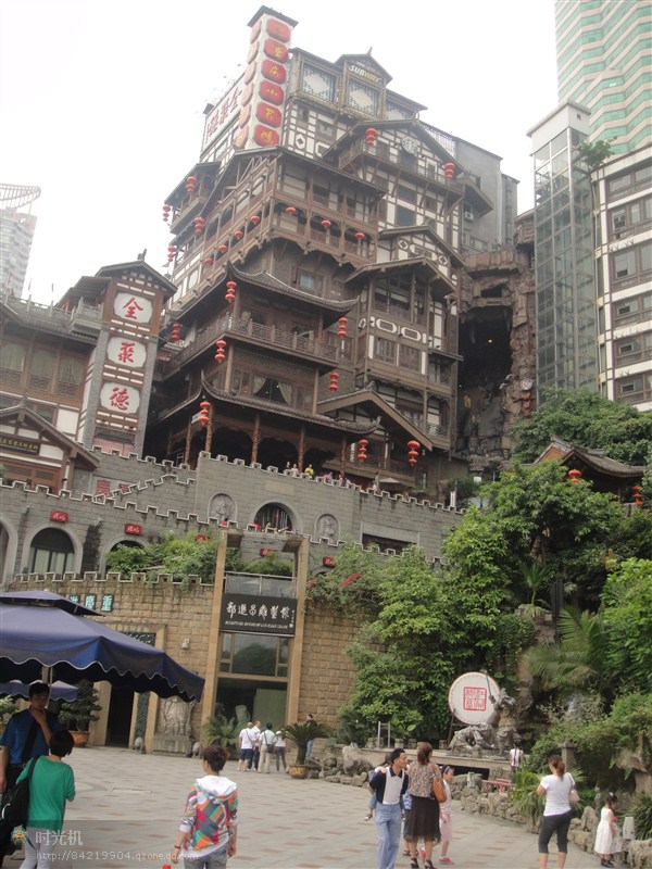 重庆 的天气并没有比上海 炎热多少,从上海 一路直飞重庆 ,下了飞机,打车直奔洪崖洞,正好50块大洋。下车后,抬头往上一看,才发现所谓的洪崖洞确实是一个傲人的建筑。而重庆 遍地是山,但在这个山头的这个山寨,却硬是被活生生地凿开了几个大洞,并且高高耸立。我们一一拍照,高兴得合不拢嘴,不知该声称人类的无比伟大,还是自然的力不从心。