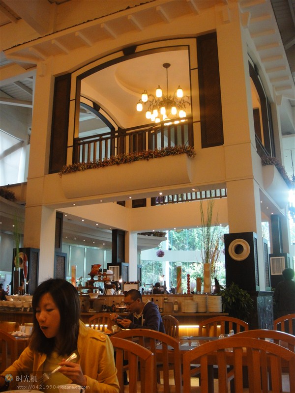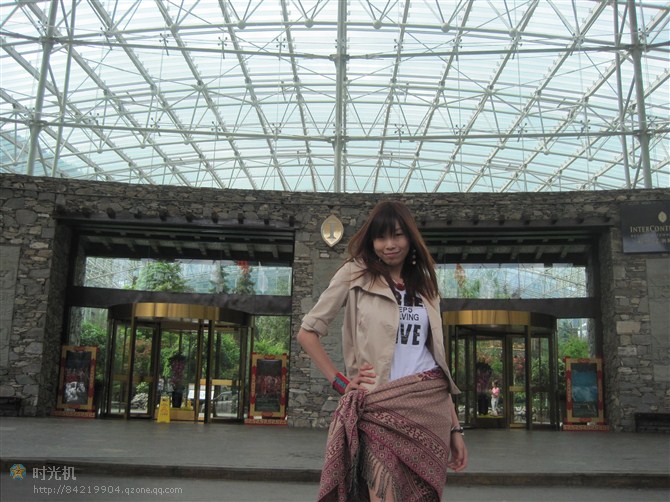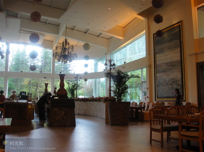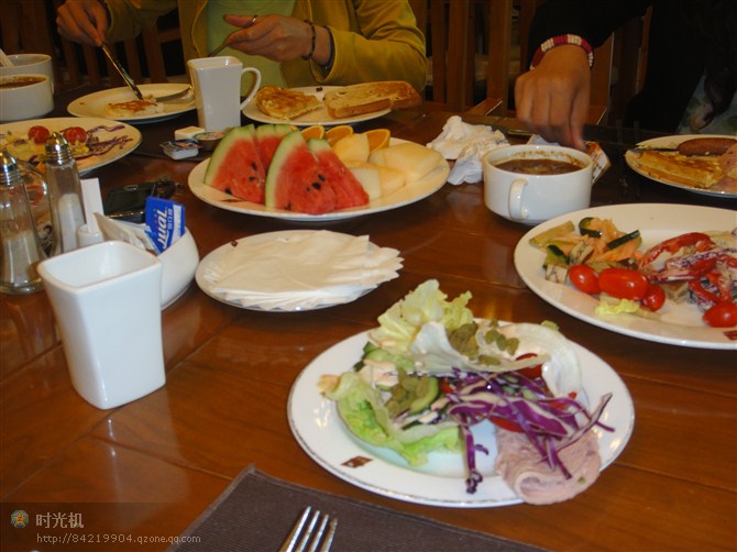 起床的时候已经是9点了,我们化完妆,跑去吃自助早餐,因为已经是最后一天了,绝对要过得悠闲一点。超五星酒店的早餐果然要比我们想像的丰盛,我们转了一圈又一圈,拿了一大盆色拉,面包、黄油、果酱,蛋糕、水果、牛奶、各种肉类小吃……美味无比。直到10点超过,司机王师傅来电话催了,才跑到楼上整理行李,临走时还不忘与酒店景色合影一番。