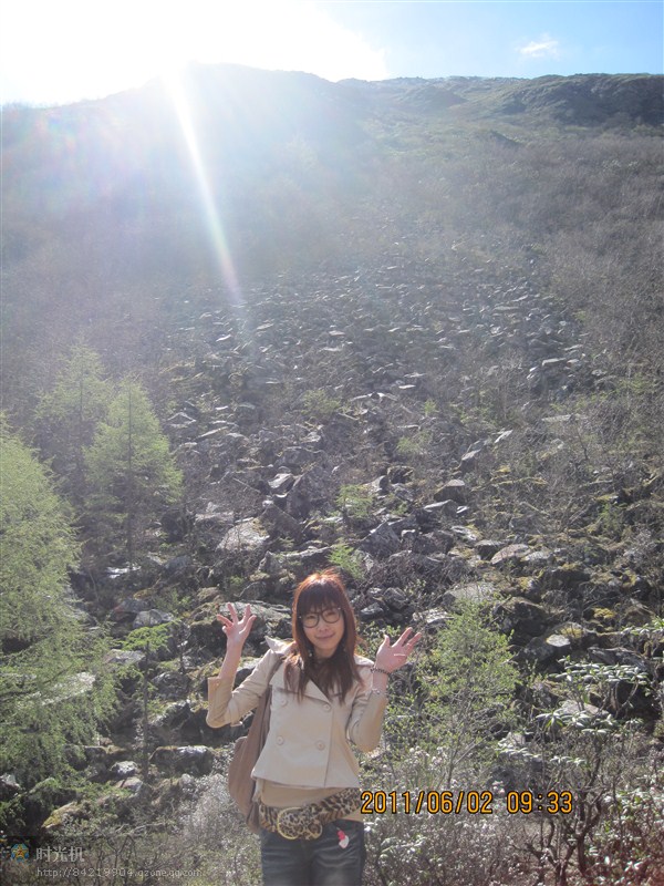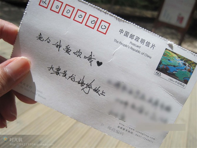 黄龙 全程5个半小时,从上山到下山的确有点长,我们一路走来与很多人聊天,聊自己的家乡,聊别人的家乡,也聊九寨沟 。我们在山上啃自己随身带来的食物,愉快得环顾四周,聊工作聊感情,顺大便再聊聊将来。中途的时候,毛毛的牛仔裤破了个大口子,我们大笑,她家里唯一的一条裤子终于壮烈牺牲,并且这一路她还要若无其事的欣赏美景,的确有点为难她了。下山的路很是好走,我们边走边看,胡平看到一个邮箱,便到处询问哪里可以盖邮戳。在几经波折发现徒劳无功之后,我们也分头找了张椅子,把门票上的明信片撕下来,开始写留言以及地址,爱寄谁寄谁,哈哈。