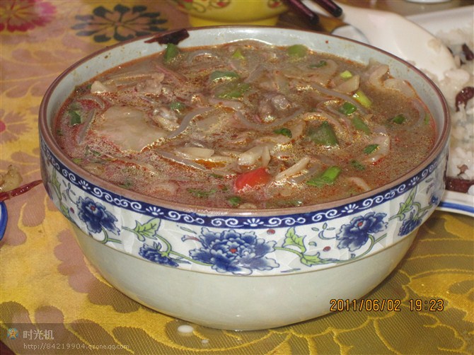 好不容易等锅里的水开了,乱七八糟一大堆荤的素的下去,汤底又恢复了平息。等不急的我们再饿也只能在一边苦等,用筷子在平静的锅底里晃荡一下,出现几圈涟漪,实在忍不住,也只能咽下一口苦水。再然后,看到几个小气泡,又开始兴 奋不已。火辣辣的羊肉、牛肉、肥肠……沾着从来都没有吃到过的自制酱料,再配上一杯美味的绿豆沙,已经幸福到了极点。茶足饭饱后,忍不住想摊坐在长椅上,等着下一顿的晚餐。