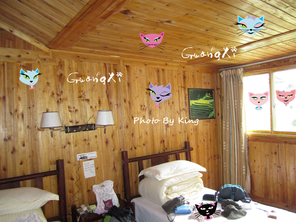 吃饱喝足,孙狗肉给我们房间的钥匙,让我们下午就直接呆在这边休息,下午的行程等他明天带团进驻的时候,我们再跟上(途中收了一个70的漂流,自由滴)。协商没问题后,直奔房间,木格子的房子,走起来就是不一样,咯吱咯吱响,后来发现,原来寨子都这格调,还好没有啥蚊子。床上给的是冬天棉被,这真的顶用。六月天,在山里头却似深秋,所以亲们记得入住的时候要准备一件秋衣吖!