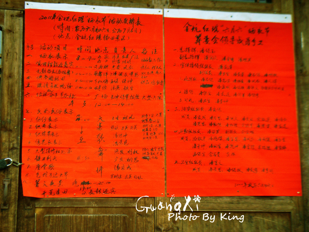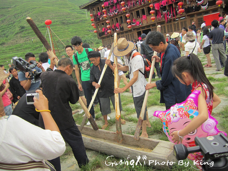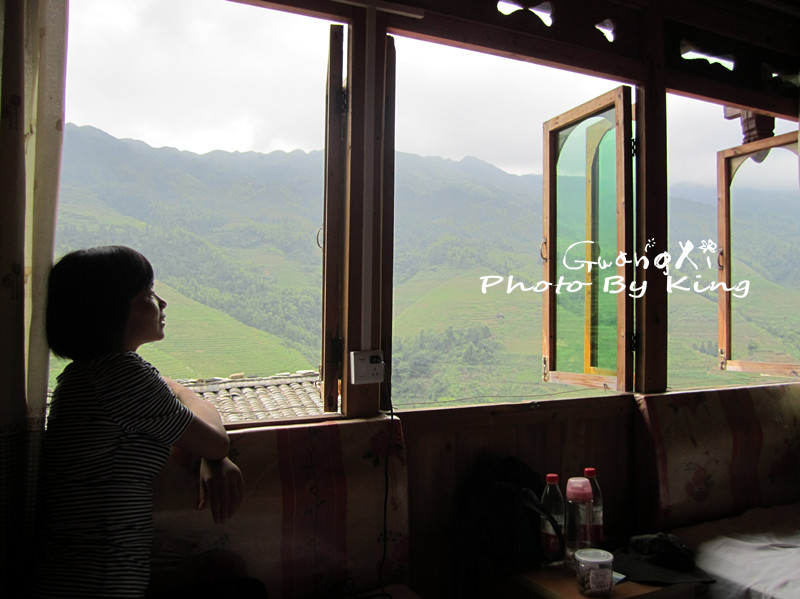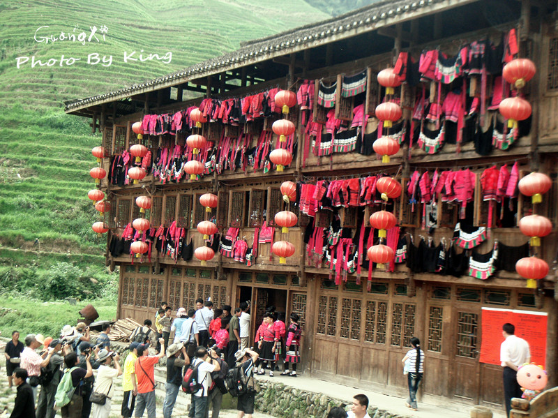 观看完NO2九龙 五虎之后,大概6点,我们迅速回到楼阁,老板娘饭菜已经做好,正在等我们开饭呢,( ⊙o⊙ )哇,有饭吃真幸福!!大哥告诉我们明天大寨梯田有个晒衣节,既然赶上了,就一起去凑凑热闹呗,之后の广西 之旅,大哥几乎都和我们两一块驴了。和孙狗肉商量好明天不用接我们和退款的事情,吃完饭,楼阁老板帮我们预订大寨的房间,如果米有阁楼老板的热情,我们肯定无法在大寨预定到房间,因为,大寨过节,甭说驴友,摄影发烧友都特别多,临时要房间是较困难滴。这老板是个好人,房间也不贵,50-80一晚,环境也还可以,老板娘厨艺也OK, 本来说了要回来帮忙宣传的,可是卡片不见了,呜呜,所以大家平时去的话,记得这里啦。叫做:月亮湾,下图右边中间,老板是个帅小伙,老板娘是个美女。(*^__^*) 嘻嘻……