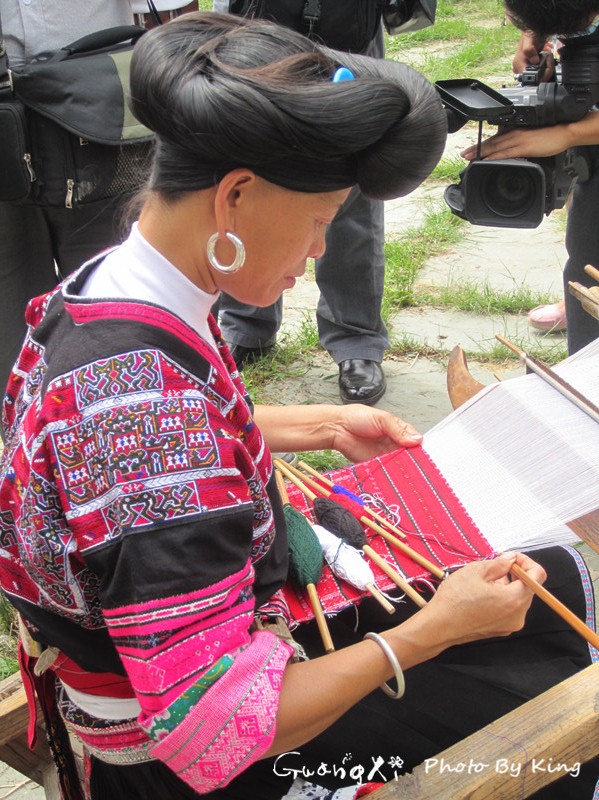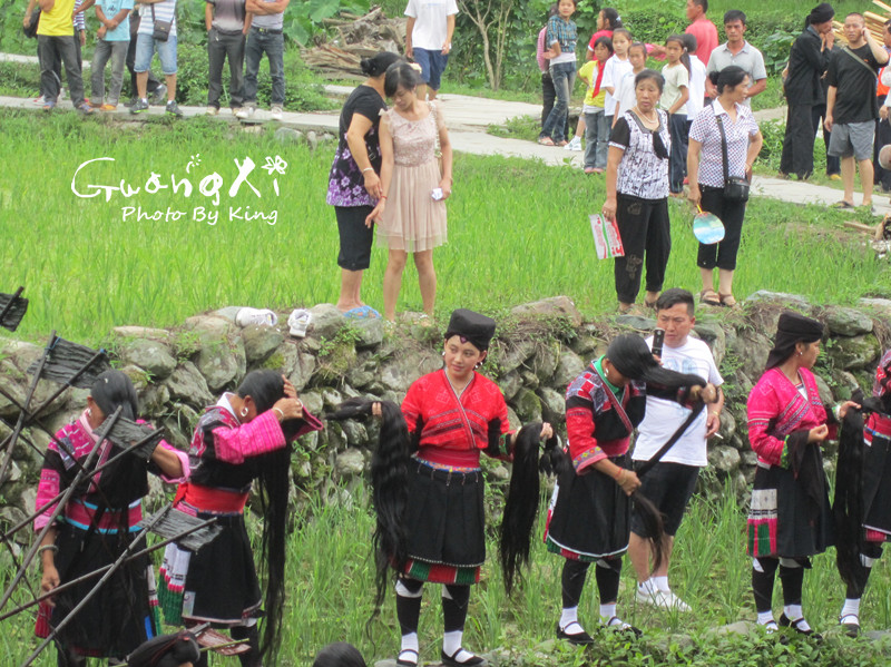小溪边梳发展示:说到这个还是蛮有意思的!瑶族人の头发很沉很长。一共有三组头发组成。第一组是到了十八岁成年人时剪下来の,(她们从小不剪头发,到了十八岁才剪一次,并且保存下来)第二组是十八岁后一直留着の头发,第三组是十八岁后,梳头发掉了の头发。她们把这三组头发卷在一块,在头顶上盘成一个謦。如果大家想和她们照梳头发の相片,是需要给10元钱の,呵呵,你瞧,处处商机!