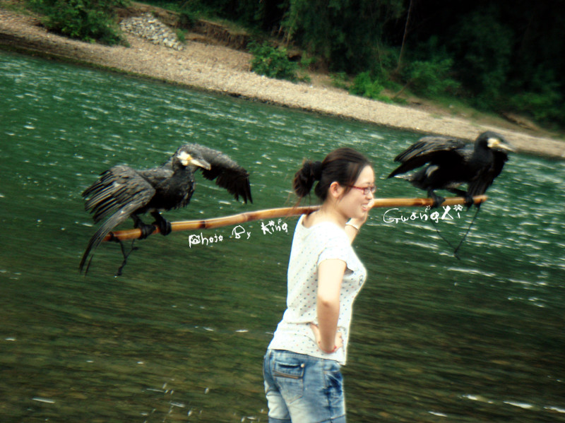 每个景点都有停站拍照の地方,如果你要停下,告诉师傅就可以。这是九马画山停下来拍照の,这两只被绑在棍上可怜の鸬鹚鸟,10元⑨被捆绑住了。。。。