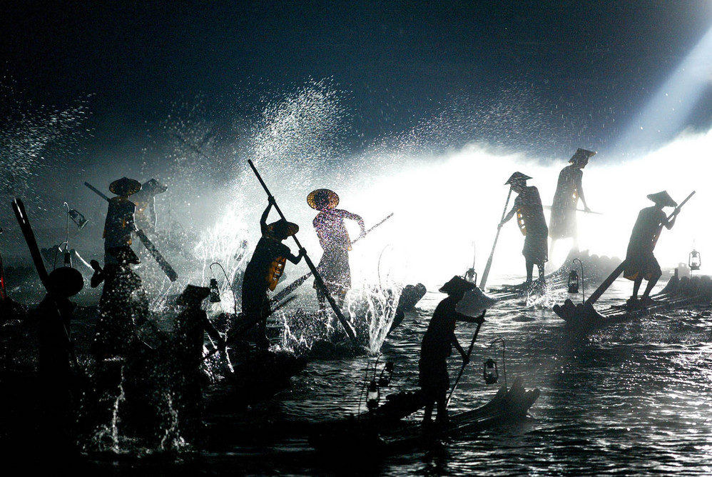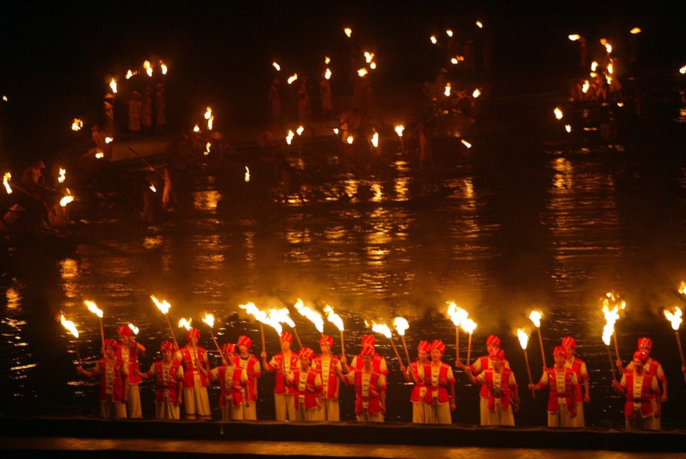靠近表演河两边の村庄到了晚上6点,就准时有村庄人守候村口,不给陌生人进去。除非你是给了40进去观看の。进去后里 面有户山庄似の茅屋,茅屋主人会给大家搬出椅子在指定位置观看表演。蚊子多不怕,有扇子提供。呵呵。。。别说,来看的人还真多。不能说被骗,人家确实很靠近表演中心,只是你无法从正面观看,只能从侧面观看,视觉角度不同,你可以这样安慰自己滴。。