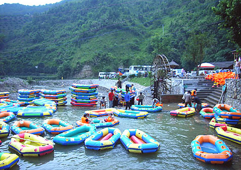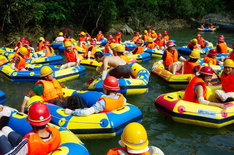 出发点。。。准备出发囖。。。一个个挣扎着往前,痛苦の我们好不容易爬前一点点,又被拉到后面去。真正体会到啥叫力争上游了,呵呵。。。。。(换好衣服后,有专车送我们到漂流起始点,到了之后,大家照工作人员要求穿好安全装备,按指示坐上双人皮艇)