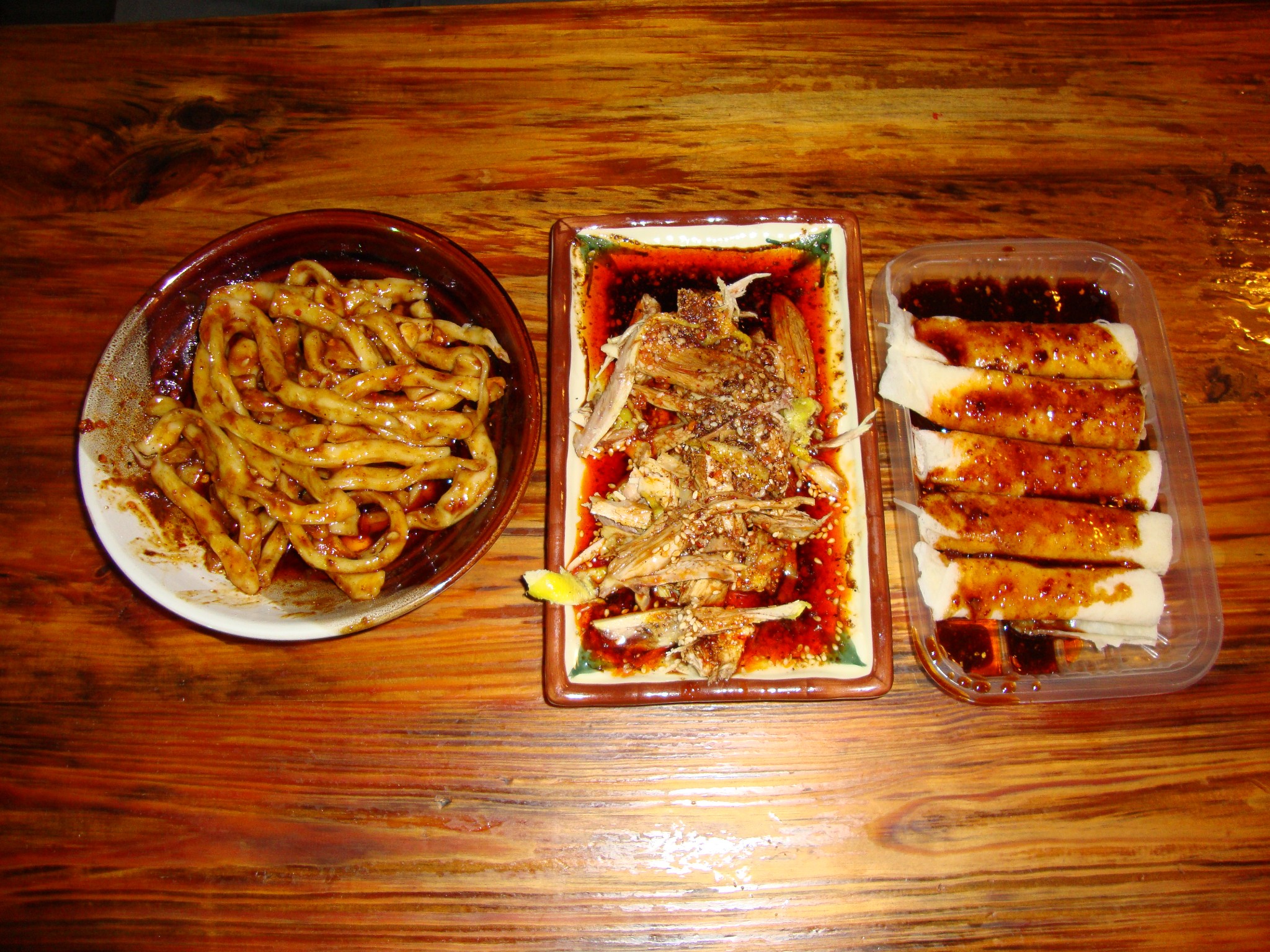 选定一家店先吃了上桌率比较高的甜水面、红油鸡片、芥末春卷,之后又点了个“麻辣兔头”,好吃的不得了。因为兔头点的晚,吃完桌上已经狼藉一片,没有再拍照。本想晚上在大馆子里搓一顿,但在这里大大小小的吃了不少,肚子已经差不多饱了,我们在闲逛的同时又吃了豆花、紫米糕、汤圆以及已经记不住名字了的等等多类小吃,直到吃不动了,才准备回宾馆休息。