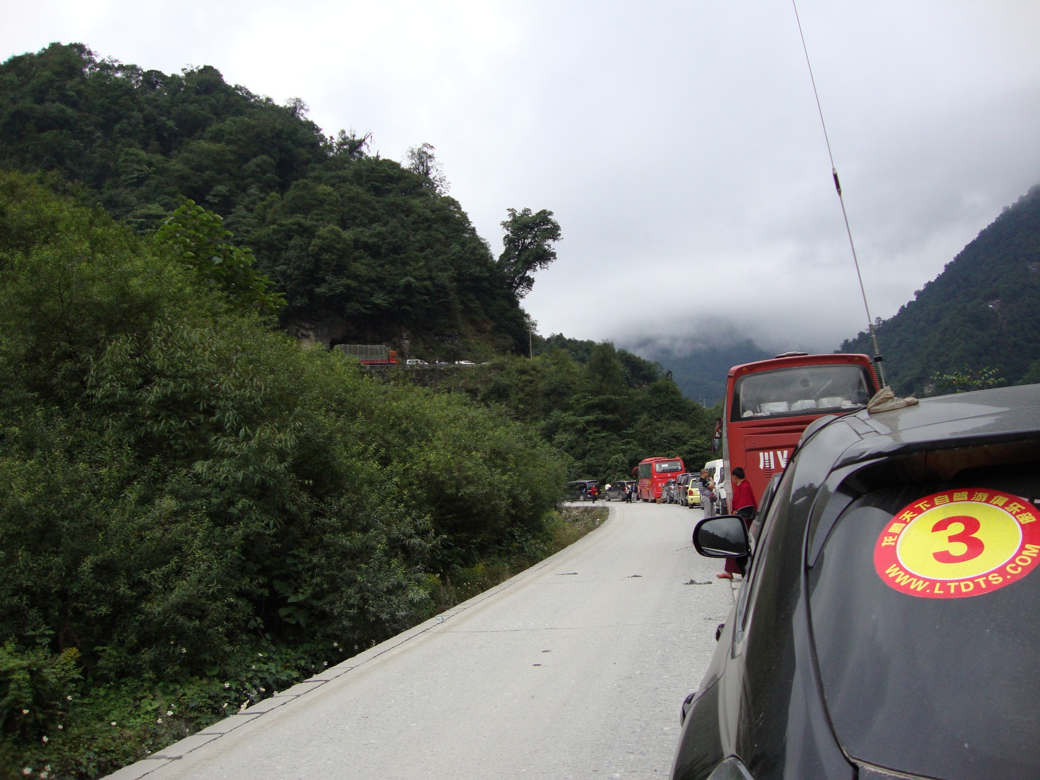 1个小时过去了,前面的车没有一点动的意思,大家都纷纷下车,有拍照的、抽烟的、聊大天的…后知道前方是出了交通事故,造成了此起严重的堵车事件。看着救护车、保险车、吊车等等纷纷从身边掠过,向事故地点赶去,大家也都没了抱怨,已经在积极的清理现场了,山路又窄,不好走,大家能做的就是安静的等待。2个小时、3个小时…我已经在无聊的打俄罗斯方块。大家都很后悔没有带扑克牌来,否则此时我们应该在斗地主或者三国杀消磨时间!前面的大哥实在忍无可忍,开始调头,准备回家,他无奈的对我们说:“就当是出来拉拉车,景点不看了,走人!”。而我们呢,还是只能默默祈祷赶快通车,我们没有选择,必须往前走!不知道又过了多久,终于看到对方的车有通过的,这是个好的开始,至少意味着我们有要走的希望。随着等待的时间无限延长,我们已经可以肯定今天是进不了海螺沟了,温泉的事儿也不要再幻想,今天的目的就是赶到海螺沟山脚下,老老实实的睡一觉。所以,再晚上几个小时我们也无所谓了,这么想着心态也终于平和下来。