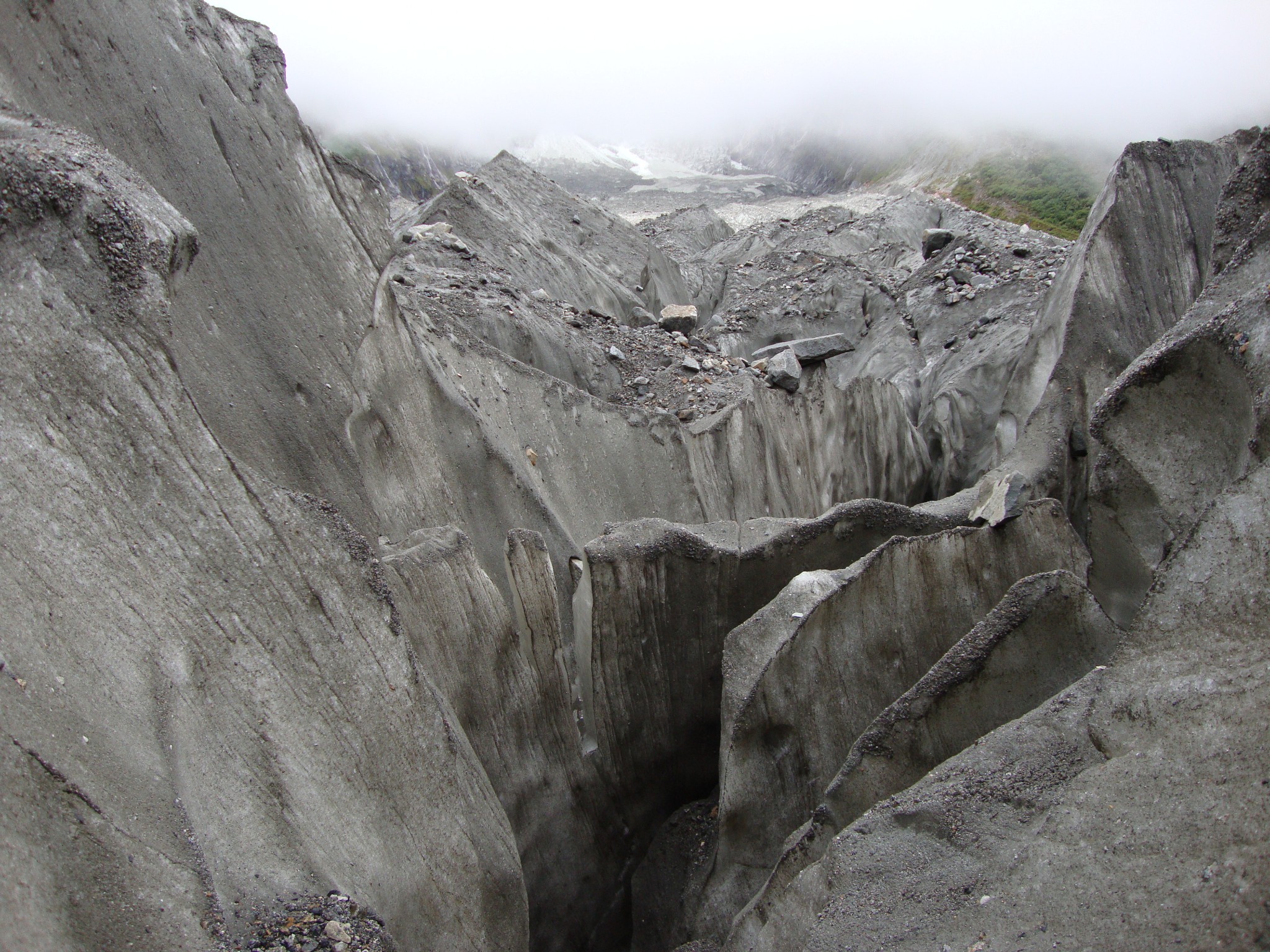 正在和冰川亲密接触时,突然发现大雾不知何时已经慢慢笼罩,冰川几乎看不到了,更别说后面的冰川瀑布。刚到山顶的悲催小妹摆着各种POSE在照相,为她照相的人问:“后面一片白色,照个啥?”,她郁闷的抱怨着:“看不到冰川就照雾吧!”。我们确实幸运,如果晚到20分钟就会是同样的结局,花了大把银子拥抱的只有大雾。