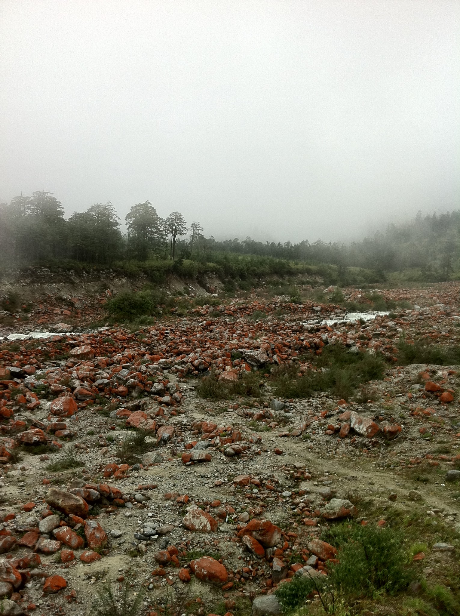考虑到其他团友在等,我们没有过多停留, 11:20开始下山。到山脚下已经12:30,吃过午饭,13:30我们驶向新都桥。路途中,我们又看到了很多很多红石滩,旅游结束回家后看电影《画壁》发现那成片的红石滩居然成了其中的一个取景点,什么景色拍进了电影就显得更加仙境一般,美不胜收。
