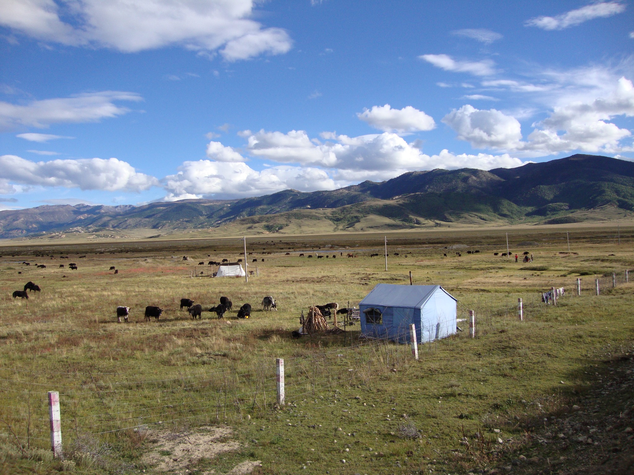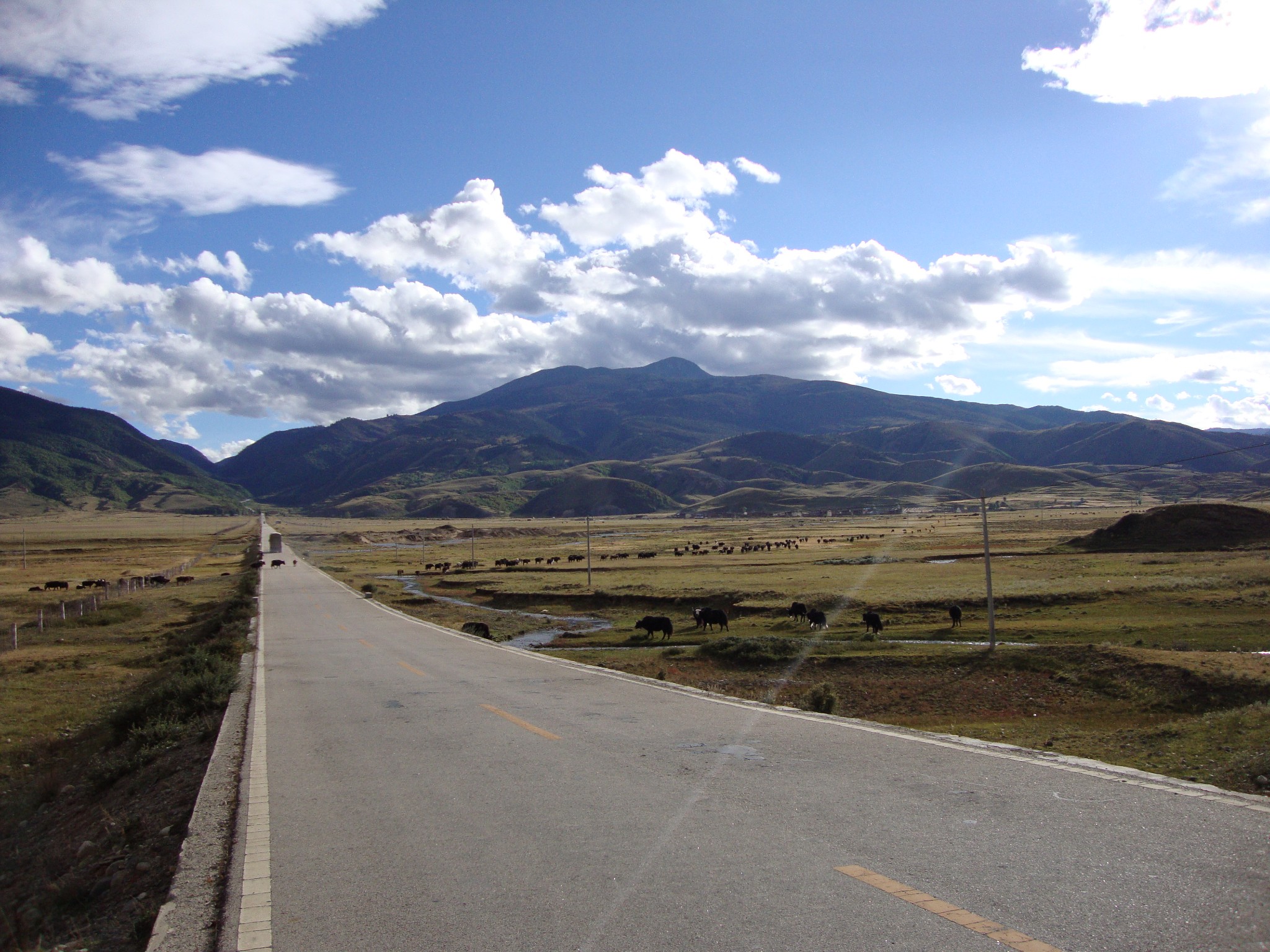 一天虽然路程艰辛但还好沿途不时会有不错的景色可以随时停车拍照,结束了恐怖的318国道后,18:00左右我们驶入了一段平坦宽敞的柏油马路,吴师傅说距离稻城也就还1个多小时的路,我们顿时觉得轻松了很多。此时本已是傍晚时分,但就在此地,天空却依然晴朗明亮,太阳还没有一点要下山的意思,我们的战车在一望无际的马路上散了欢儿似的狂奔着,不多久,突然感觉自己置入了一幅美丽的画卷:小河、牛群、零星的帐篷、掺杂在草甸中得潺潺小溪、再加上当前的阳光灿烂、蓝天白云…全车的人都按捺不住开始大呼小叫,无限感慨!吴师傅很有眼色的在一小桥处停车让大家下车拍照。怎么空气能如此清新?怎么景色能如此美丽?我们手中的单反、卡片机忙个不停,只是惋惜自己没有那么好的摄影技术及装备把所有的美景收于囊中,但这样美的景色即使是卡片机照出来也可以当明信片了!