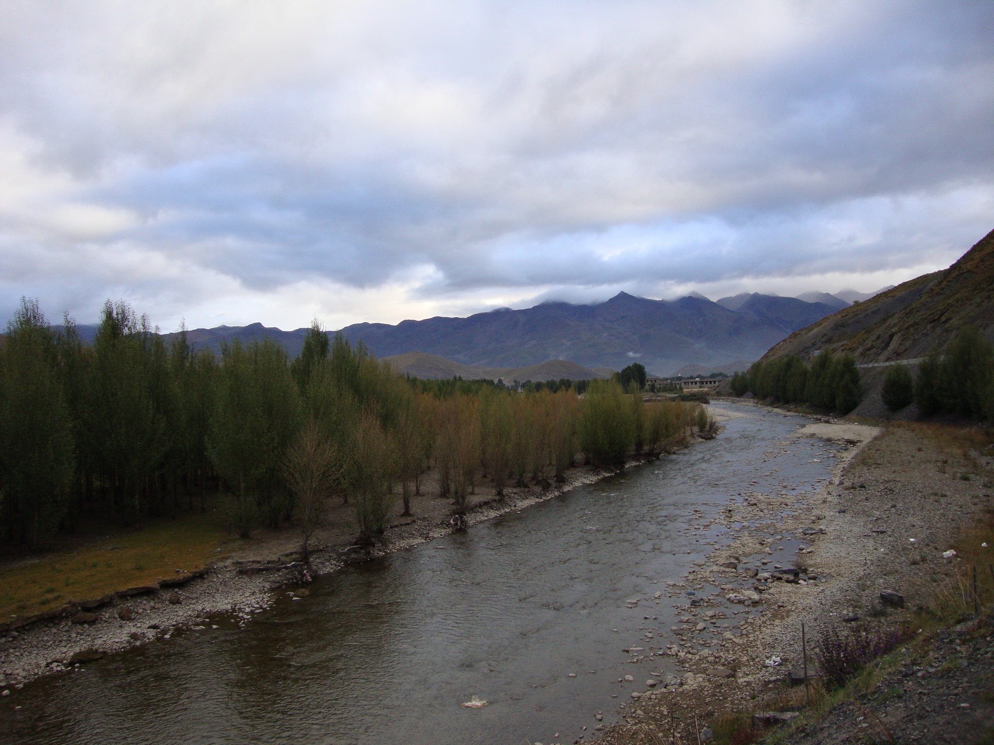 开始大家面对这成片罕见的红石滩时还兴奋的频频下车拍照,但后来应该是审美疲劳,再加上沿途不错的路况,又都进入了小憩阶段。我们所走的路段属于318国道,这段还好只是偶有小坑,影响不大。路过情歌的故乡-康定时,我们纷纷要求小情侣对唱,呵呵,他们还很不好意的回绝了我们。弯弯曲曲的不知转了多少圈,我们在经过海拔4000多米的的折多山时,确实感觉到呼吸有些急促,这应该就是所谓的高原反应吧。团友中有积极准备早早就吃抗高原反应药物的,我们觉得自己体力还好,没有做这方面的准备,只是带了点晕车药。下山又是不停的绕圈,之后沿途没什么吸引眼球之处,直至下午18:00多,我们眼前开始映入美丽的景象:特色的藏式建筑、高原才独有特别形状的大树、罕见阴晴参半的天空;再望另一处,一望无际的草甸上牛儿、马儿还在悠闲的吃着小草…这是一种安静平和让人与世无争的幸福生活,这是一处幻梦幻真让人无限向往的人间天堂。