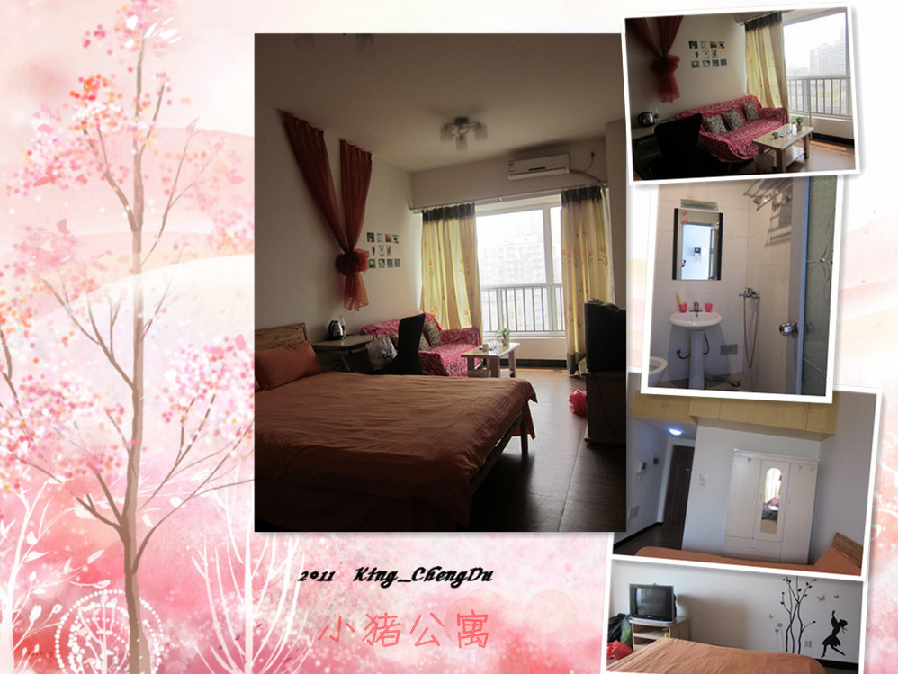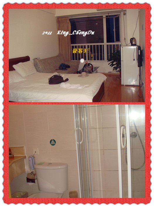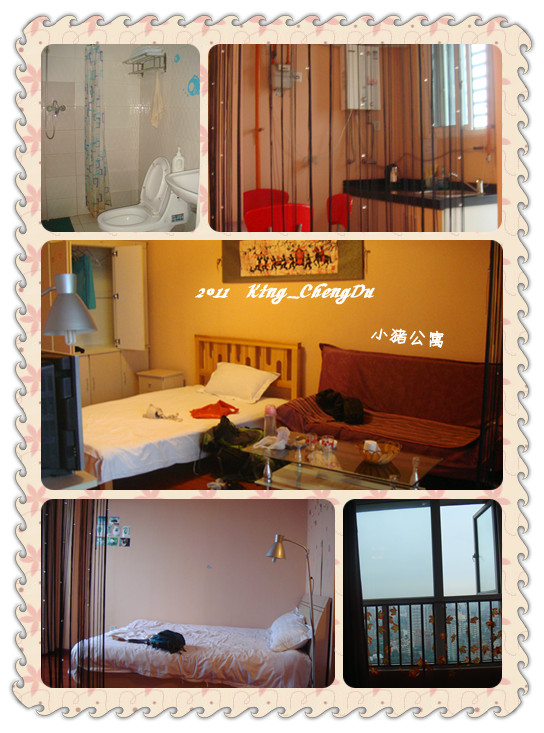 到达小猪公寓 ,老板不在,但是接待の小妹和大姐很NICE,热情招呼,热情推荐。所以成都 の六天,几乎都窝那了。其实也是看到蜂窝介绍滴,确实不错,类似小区单身额公寓改装の,下面我们前两天住的房间,可以居住一家子了,才145/RMB天,就是没发票哈。。。